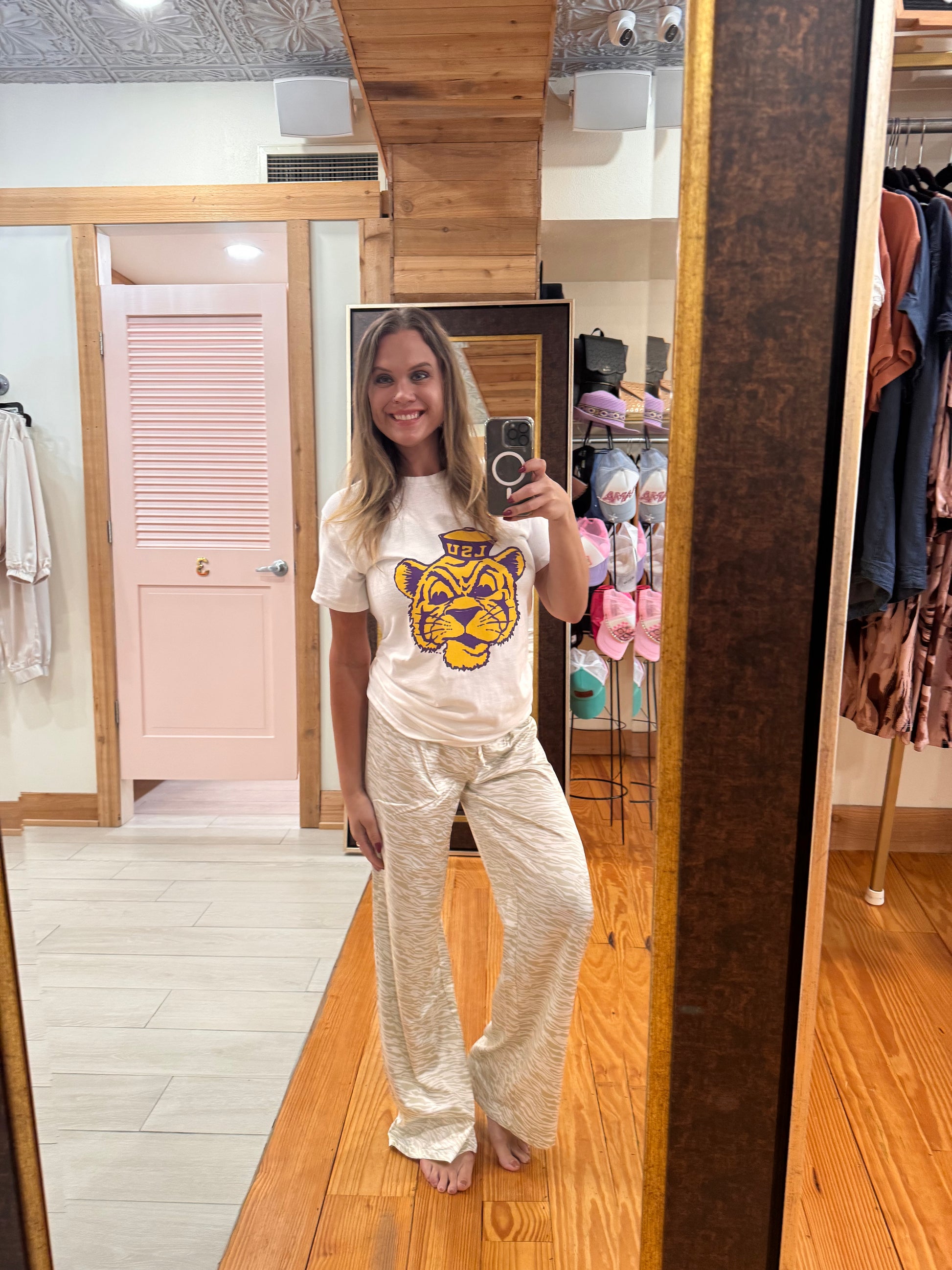 Show your Tiger pride with this bold and classic LSU tee! Featuring the iconic vintage tiger logo in purple and gold, this shirt is a true game day essential. Whether you’re cheering from Death Valley or watching from home, you’ll love the soft comfort and spirited style. Pair it with denim shorts or a gold skirt for the ultimate Geaux Tigers look!