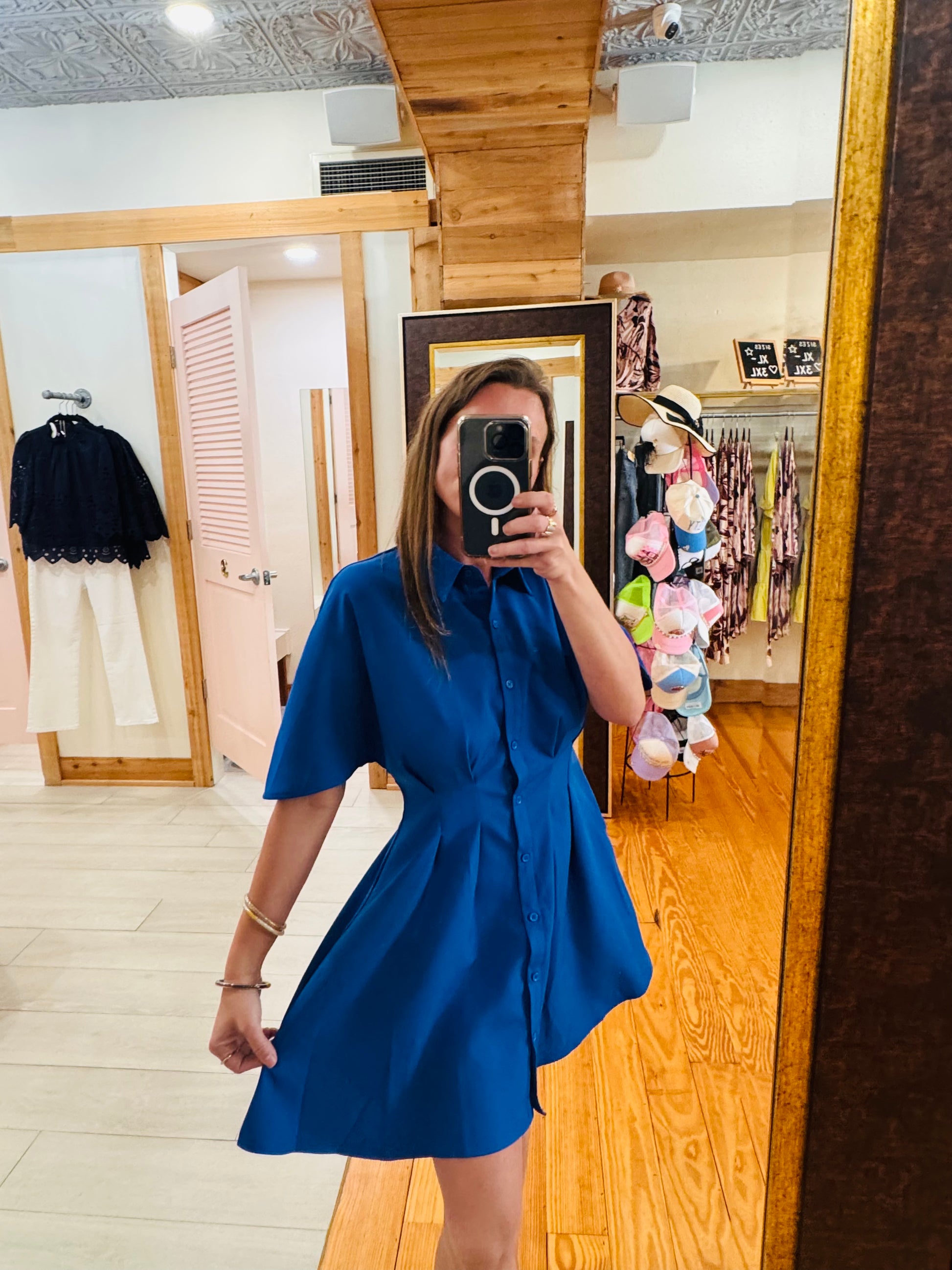 Make an entrance in this stunning royal blue dress. Featuring a structured collar, pleated front detail, and a flattering relaxed fit, this piece is both polished and comfortable. Perfect for work, church, or any event where you want to look effortlessly put together.