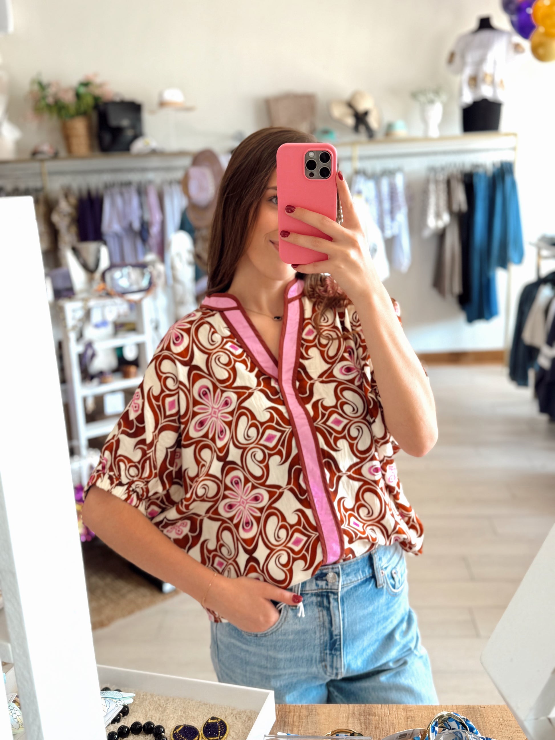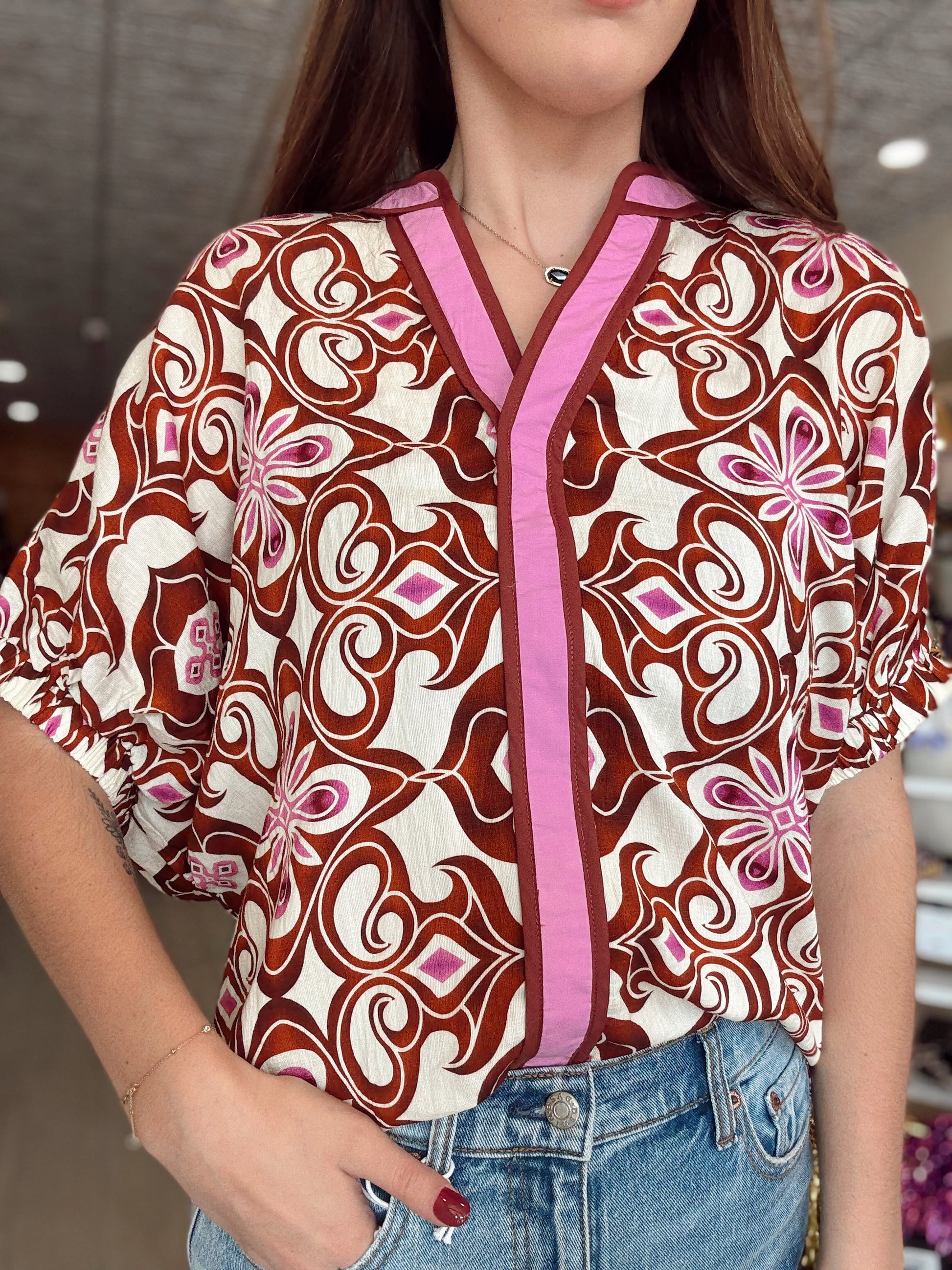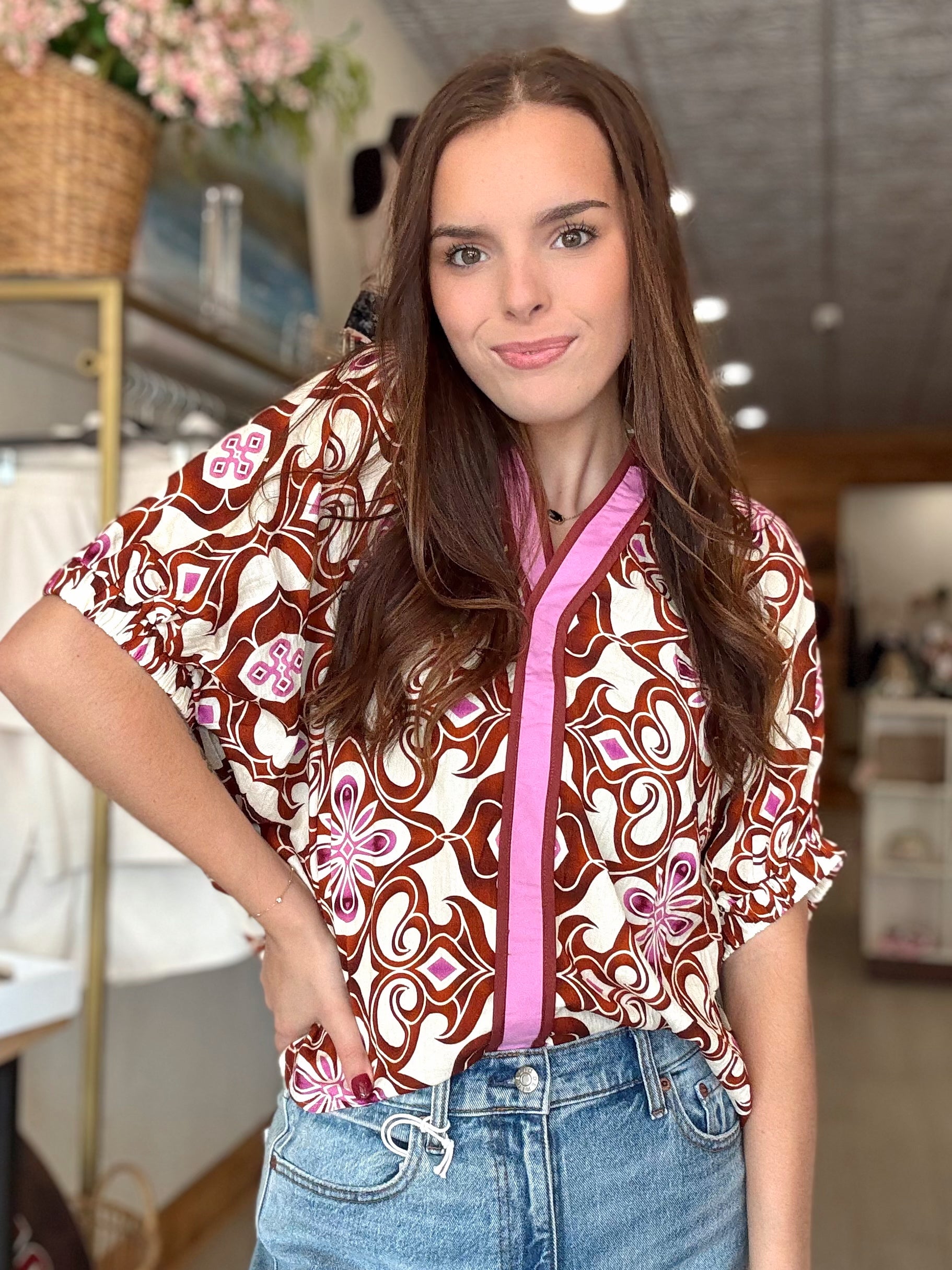 The Spice & Bloom Top is a bold mix of vintage-inspired flair and modern style. Featuring a vibrant floral and geometric print in warm rust tones with pops of pink, this blouse is trimmed in a contrasting pink placket for a chic finish. Designed with a relaxed fit, v-neckline, and gathered short sleeves, it’s the perfect piece to elevate your everyday denim or dress up with tailored pants. Lightweight and eye-catching, this top is made for standing out effortlessly.