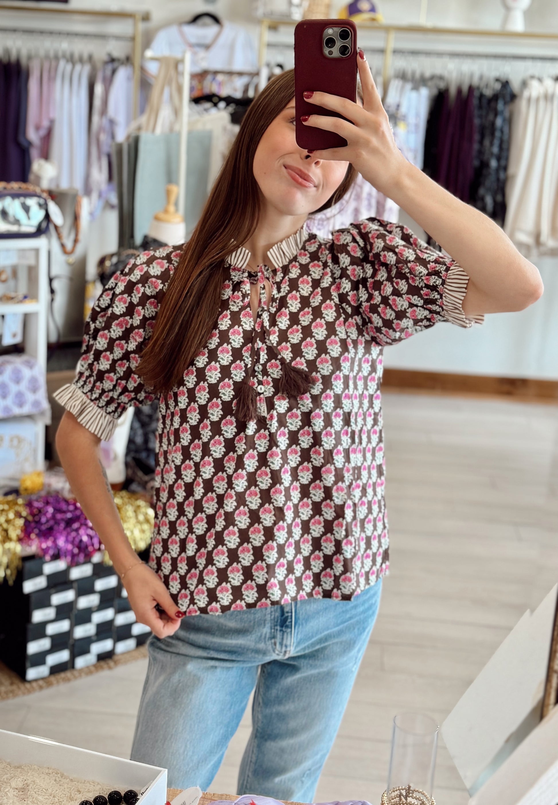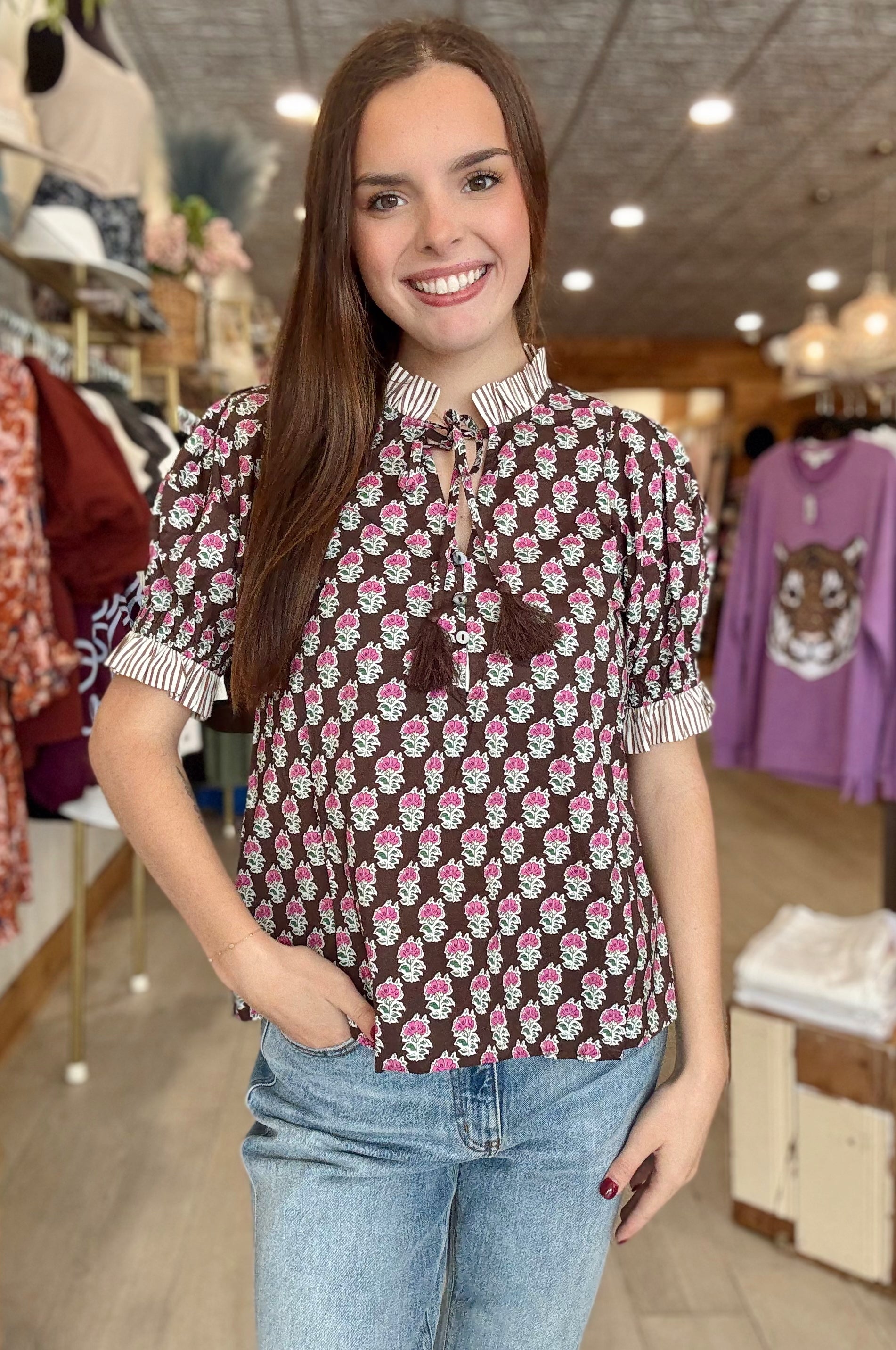 Bloom into style with our Garden Blouse—a sweet mix of vintage charm and modern detail. Featuring a chocolate-brown base with dainty pink floral prints, this top is complete with striped ruffle trim at the collar and sleeves, a keyhole tie front, and playful tassels. The puff sleeves add just the right touch of feminine flair, making it perfect for both casual days and dressy nights. Pair with denim for an effortless look or tuck into a skirt for something chic!