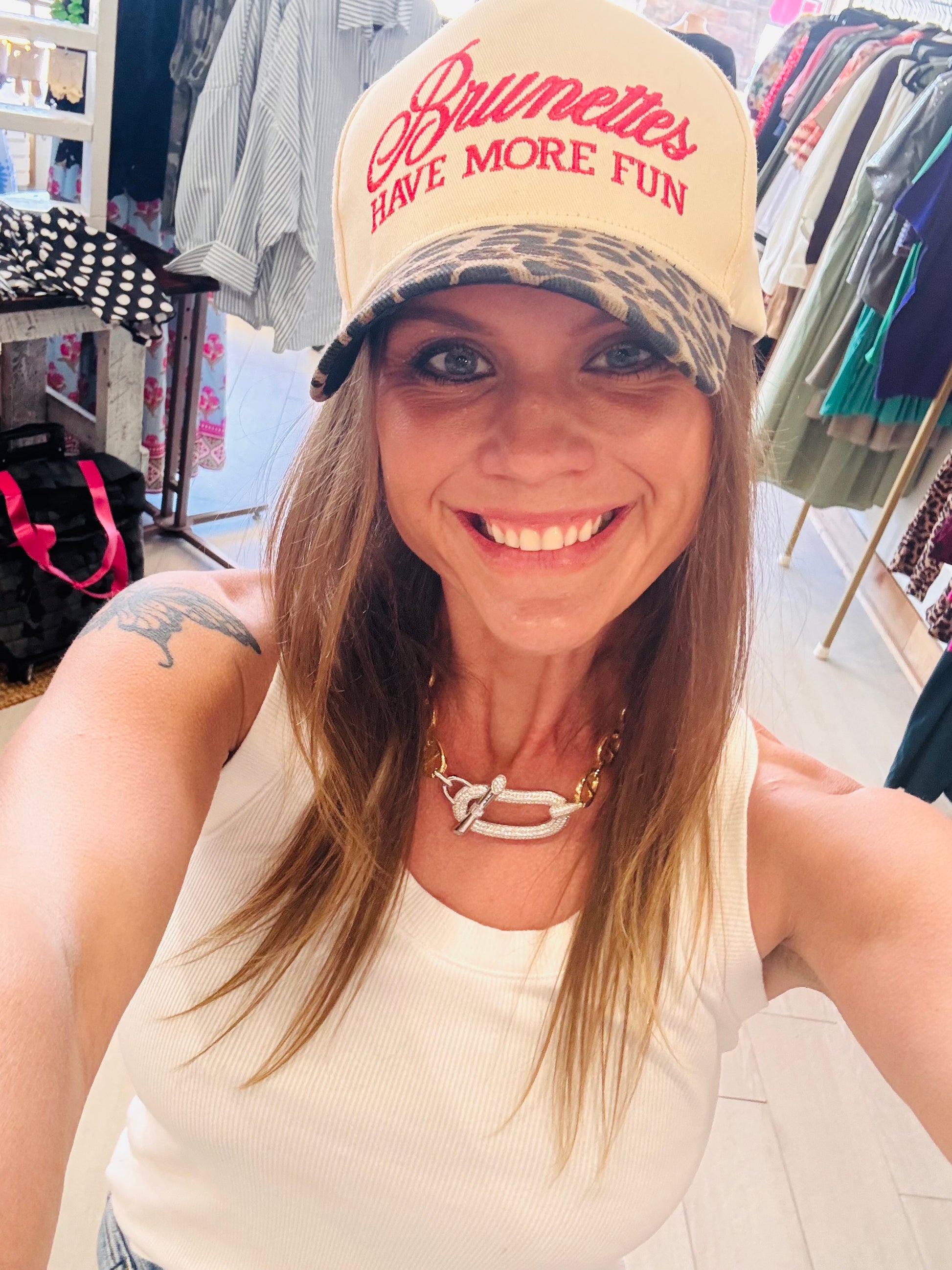 This cream structured cap features bold red embroidery that makes a statement, paired with a fierce leopard print brim for that extra pop. It’s playful, confident, and just the right amount of spicy.