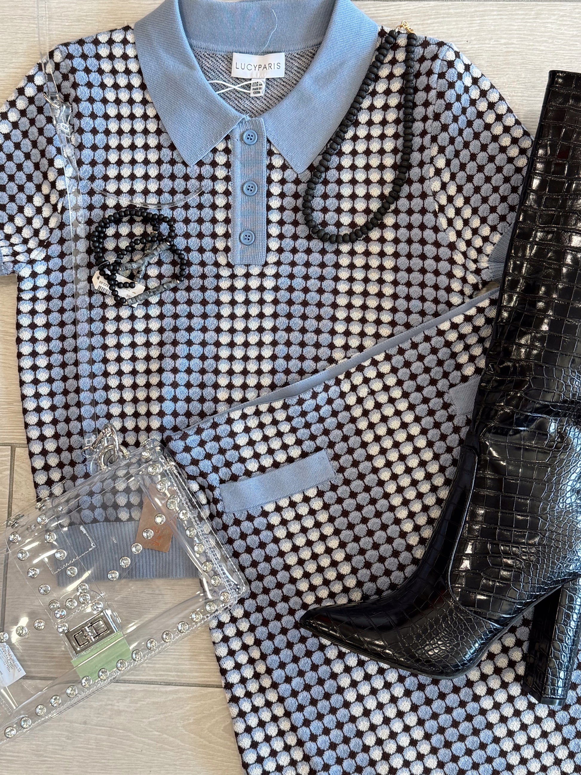 Retro-inspired meets refined in the Callie Knit Polo Top from Lucy Paris. Designed in a soft stretch knit with a textured dot pattern in lavender and cream, this chic short-sleeve top features a classic polo collar and button front for a polished yet playful vibe. Pair it with the matching Callie Knit Mini Skirt for a coordinated look that’s equal parts modern and timeless.