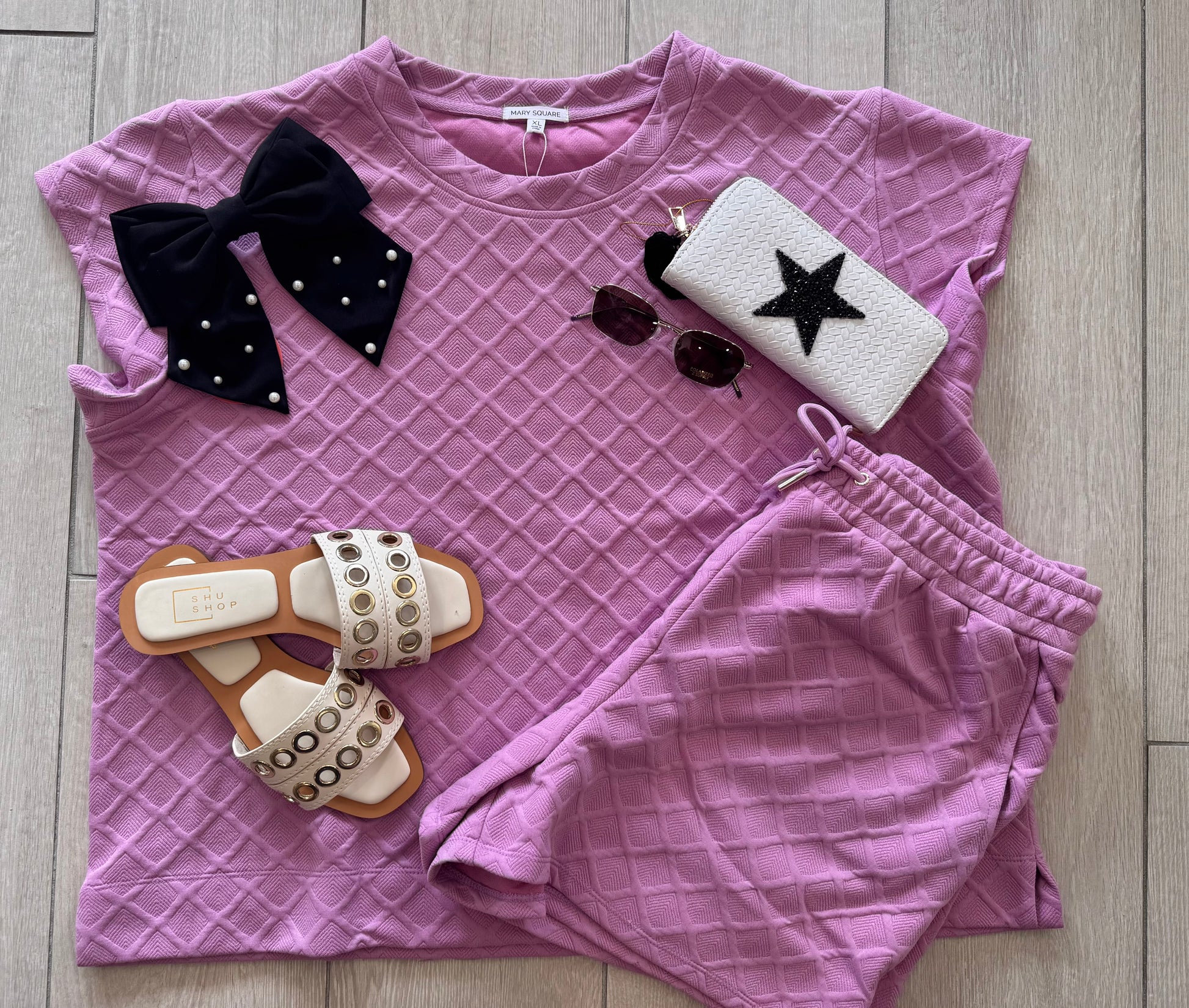 Step into the realm of unparalleled comfort and style with our Claire Set. This set features a boxy, oversized fit that ensures both style and comfort. The cap sleeves and crew neck enhance the laid-back vibe, while the slits at the hem and lattice jacquard design add a touch of modern elegance. Features cap sleeves and crew neck with slits at the hem Lattice Jacquard design 95% Polyester / 5% Spandex