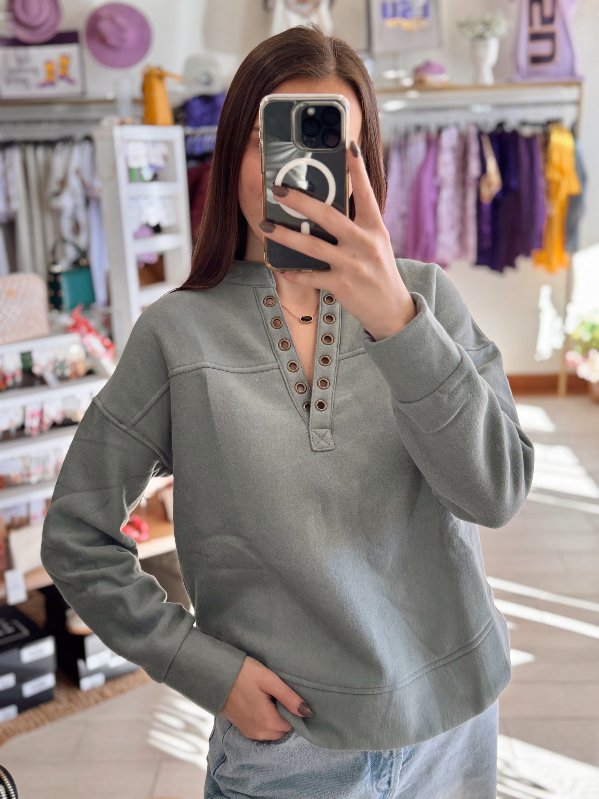 This washed sage pullover features a relaxed fit and eyelet-trimmed neckline that adds the perfect pop of edge to your everyday look. Soft, cozy, and easy to style — it’s the definition of effortless. Pair it with your favorite leggings or denim for a casual day out, or layer over a tank for those breezy fall mornings.