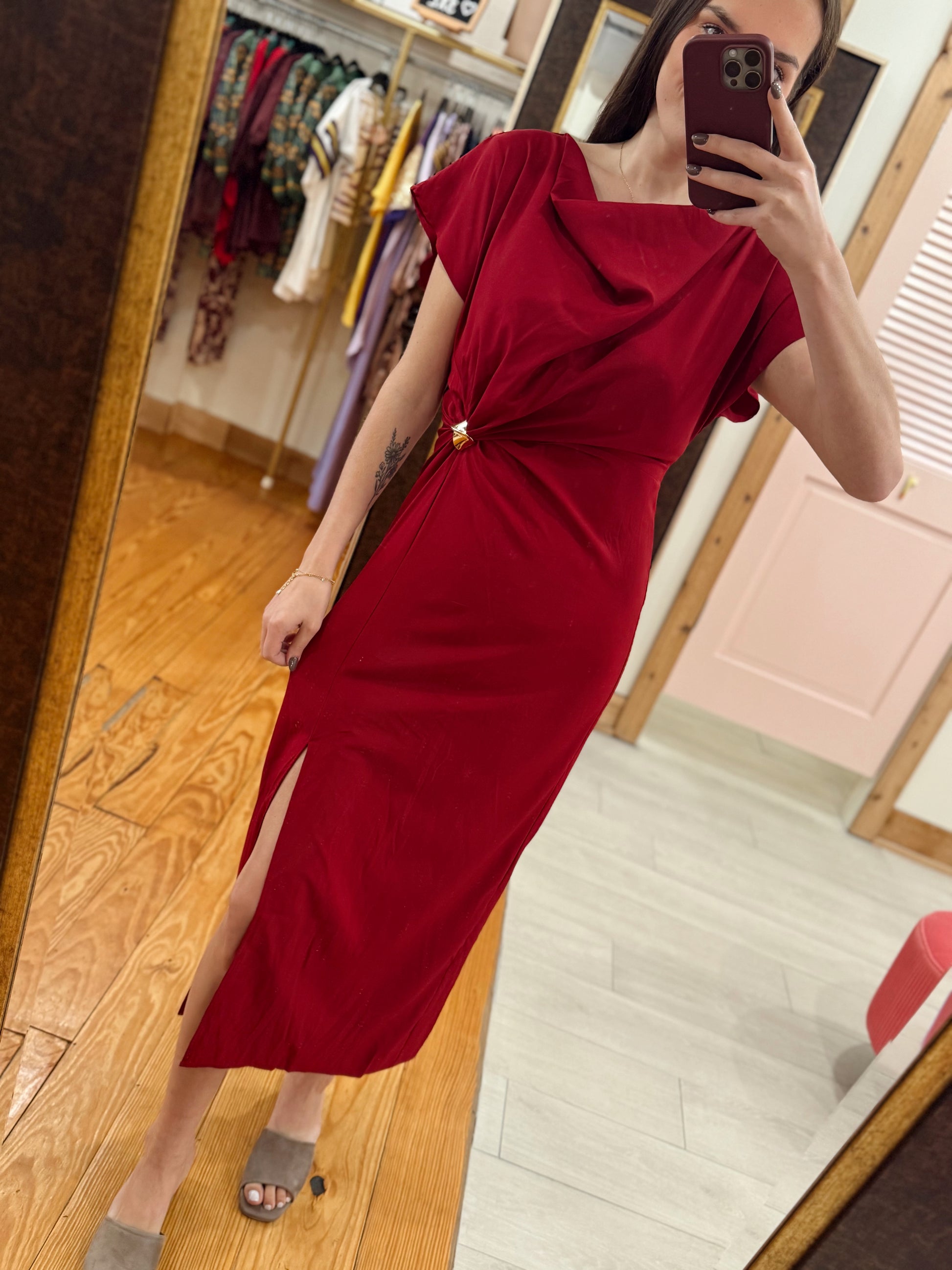 Turn every holiday gathering into a red-carpet moment with The Scarlet Sleigh Dress. This bold crimson midi features an elegant draped neckline, flattering side twist detail, and a sultry front slit that moves beautifully with every step. Its soft, satiny fabric gives off a subtle gleam — perfect for Christmas parties, winter weddings, or a festive night out. Pair it with gold heels and statement earrings for a timeless holiday look that steals the show.