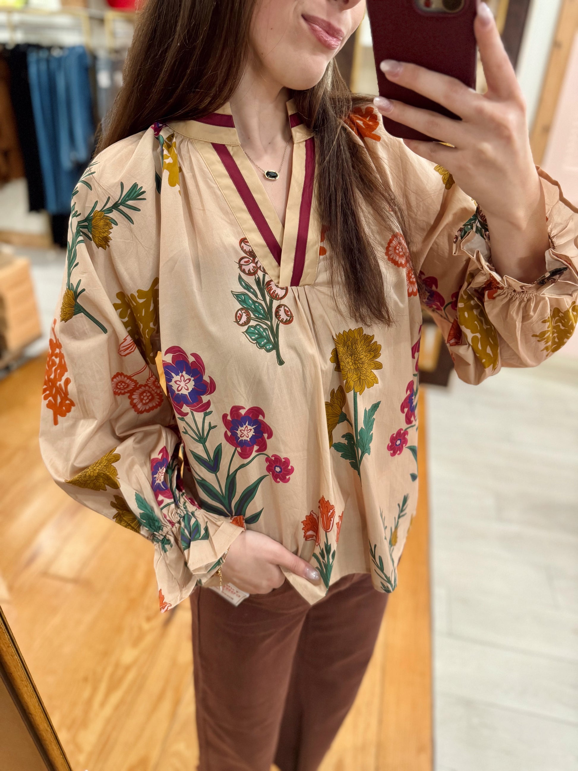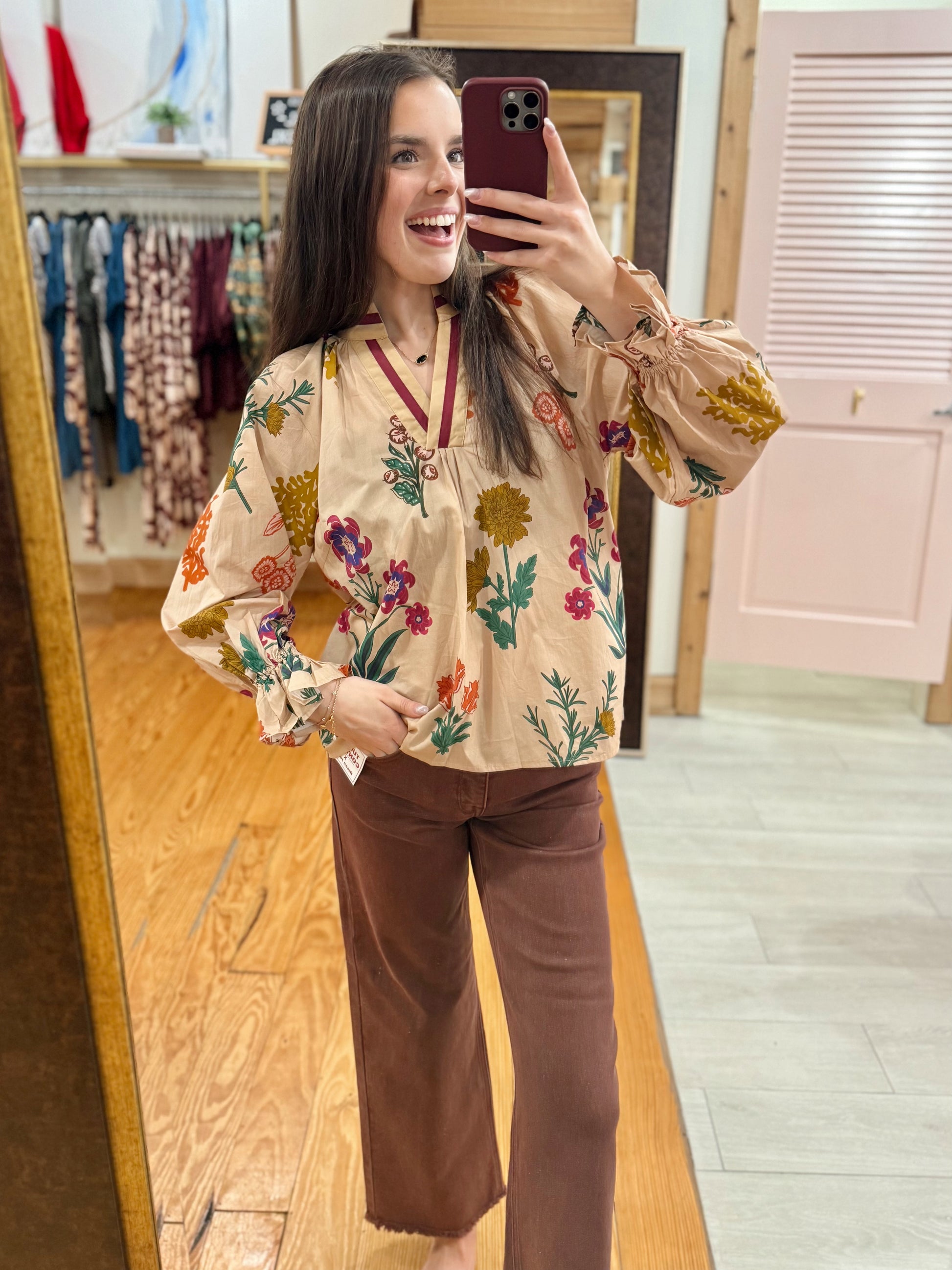 A true garden-daydream moment by Umgee! This neutral tan blouse bursts with colorful floral prints in shades of magenta, violet, mustard, and teal — giving it that playful yet polished vibe. The deep V neckline trimmed in plum and beige adds a modern twist, while the flowy silhouette and gathered sleeves keep it effortless and flattering. Perfect for pairing with denim, trousers, or a midi skirt for a chic fall-to-spring transition look.