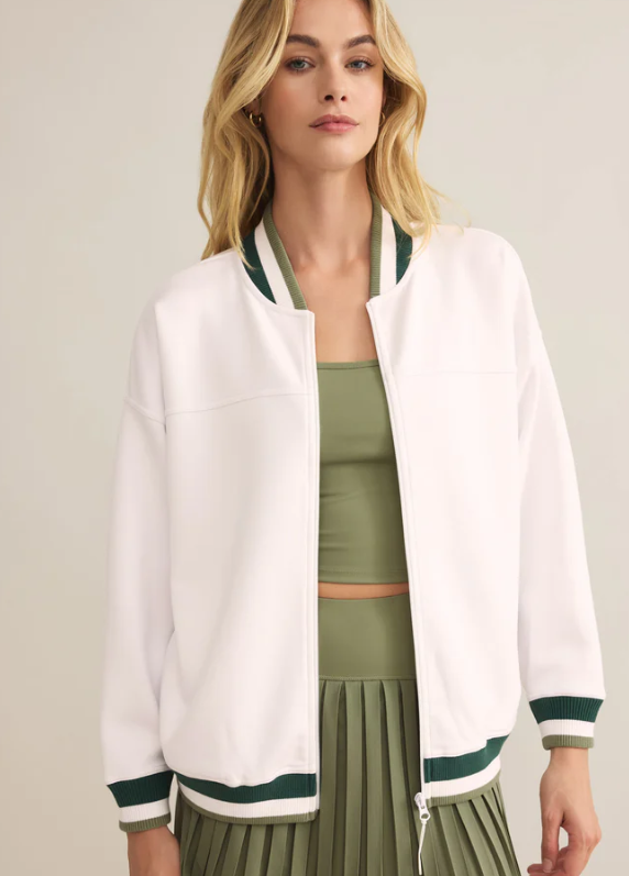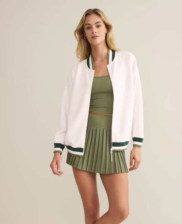 Channel classic athletic vibes with this relaxed varsity jacket, crafted from soft jersey fabric with bold accent stripes. Complete with a zip front, side seam pockets, and a collar, it’s your go-to for sporty style and everyday comfort.