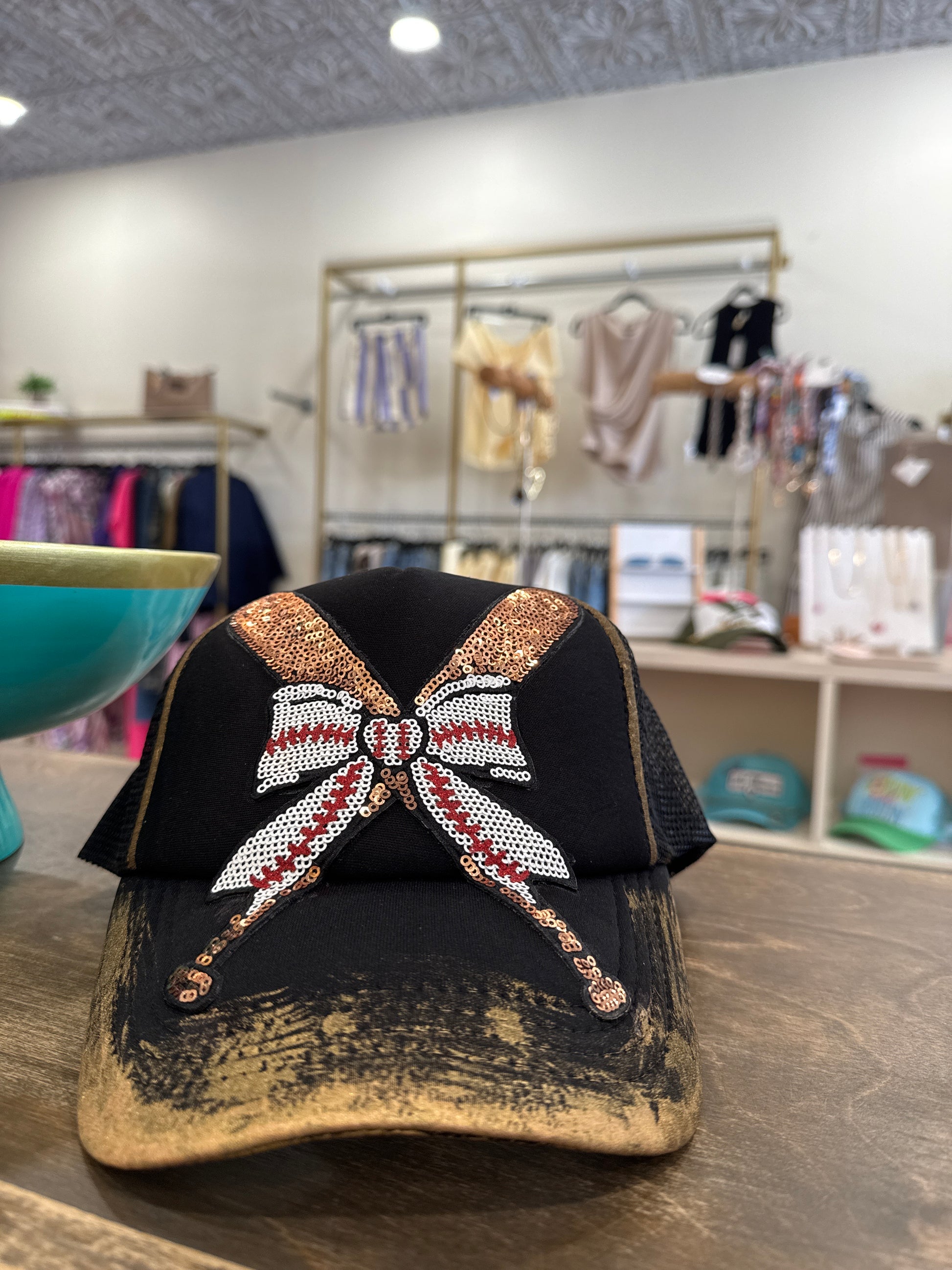 Hit it out of the park in the Home Run Bow Hat—where sporty meets sparkle. This statement cap features a sequin bow designed with baseball stitching detail, making it the ultimate accessory for game days and beyond. The distressed brim adds that perfectly worn-in look, while the breathable mesh back keeps it comfy all day long.
