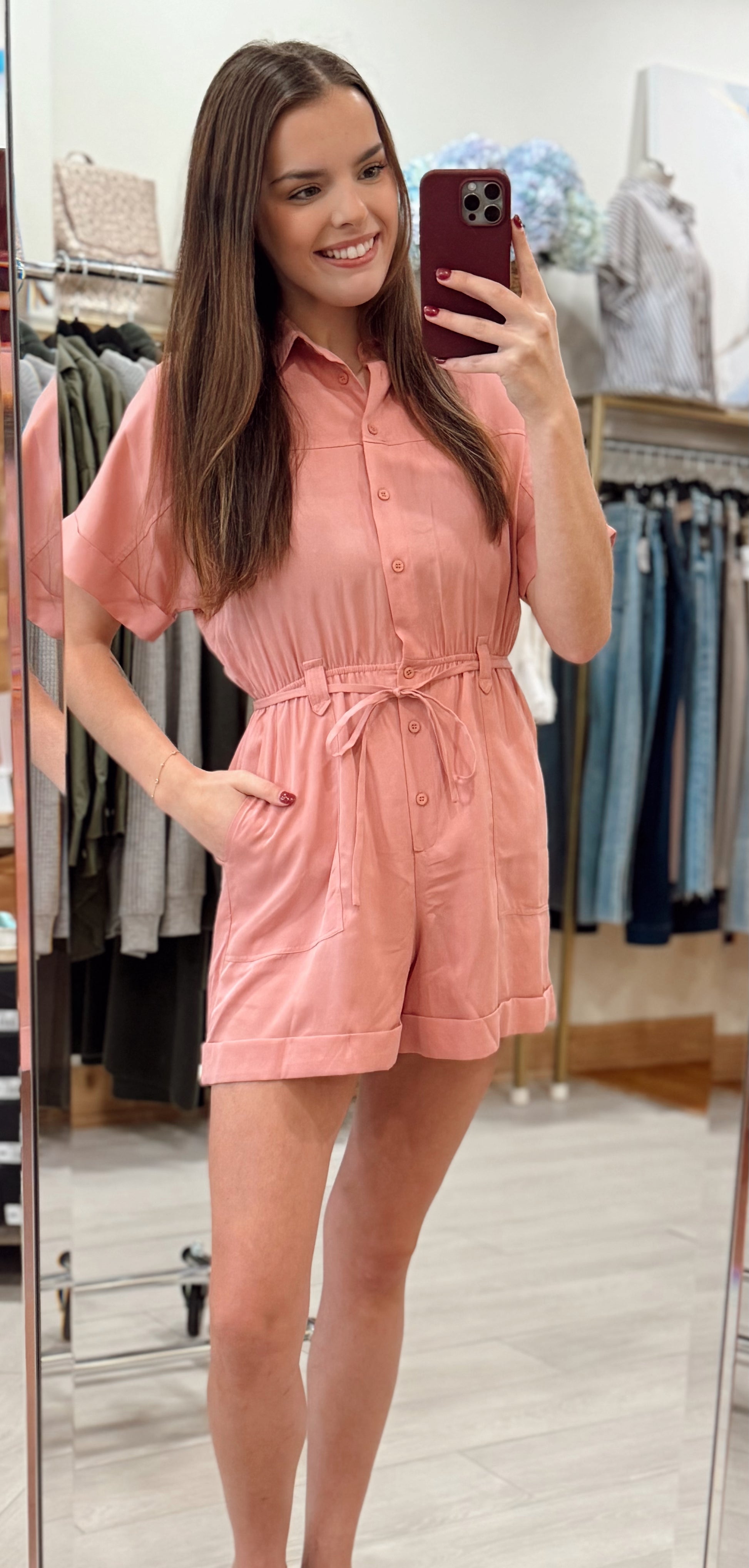 The FRNCH Lily Woven Romper is a stylish and versatile piece that embodies Parisian elegance with a contemporary twist. Crafted from 100% lyocell, it offers a lightweight and breathable feel, making it perfect for warmer days. The romper features a classic button-down front with a collar, short sleeves with lapels, and an elastic waistband that ensures a comfortable fit. A removable tie belt allows for a customizable silhouette, while the relaxed fit and short length add to its casual charm.