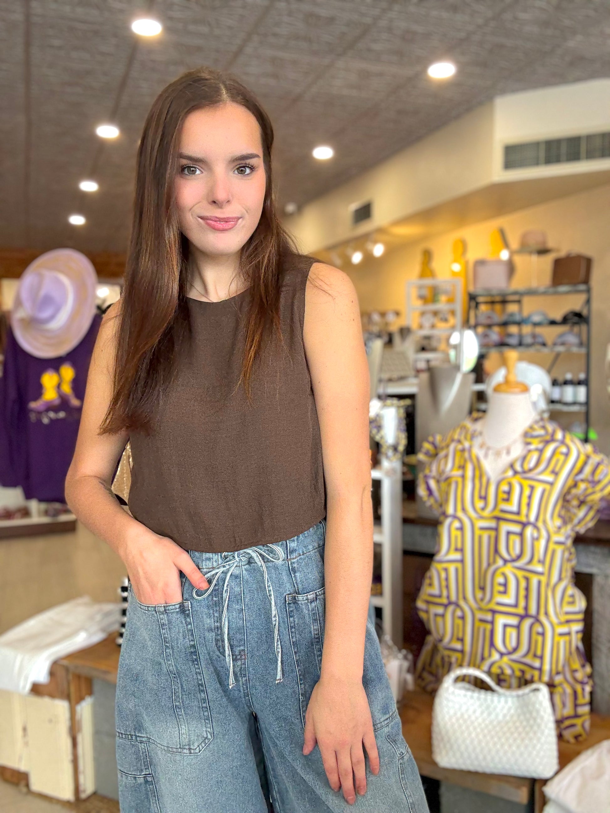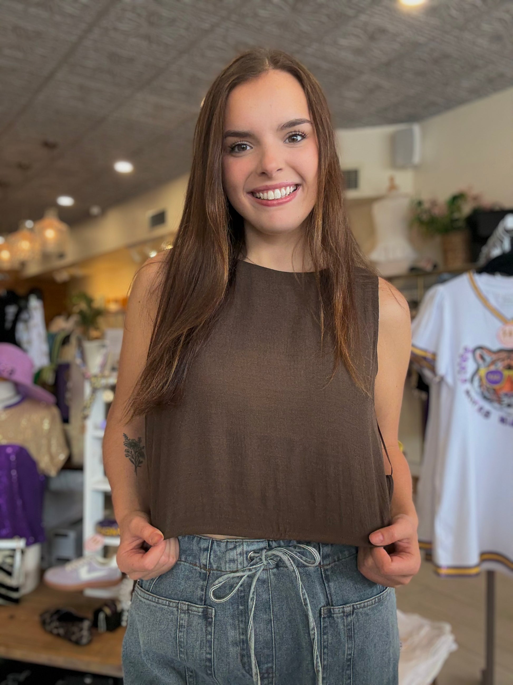Effortless style meets everyday comfort in our Brown Side-Tie Tank. Crafted from lightweight, breathable fabric, this sleeveless top features adjustable side ties for a customizable fit and subtle, flattering shape. The warm brown hue makes it a versatile layering piece — pair it with jeans for a casual look, or style it with skirts and trousers for a chic, elevated vibe.
