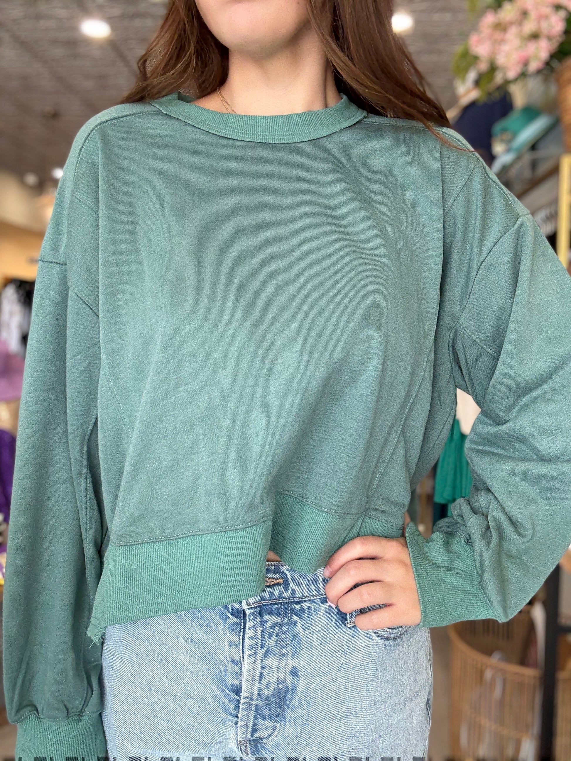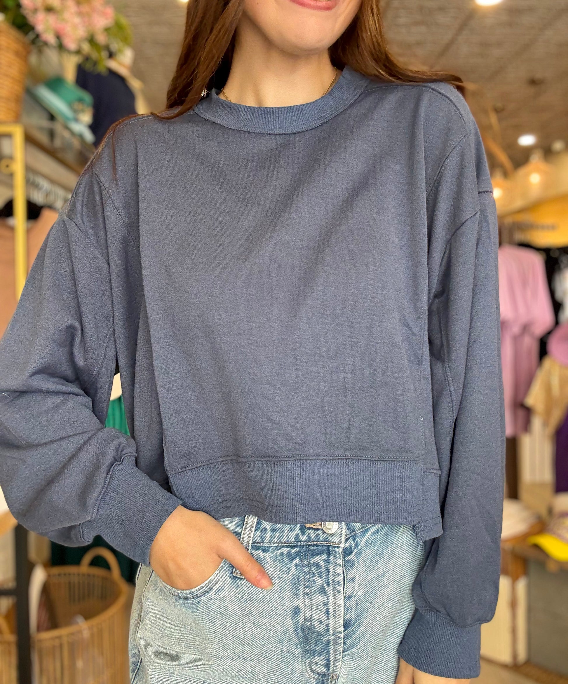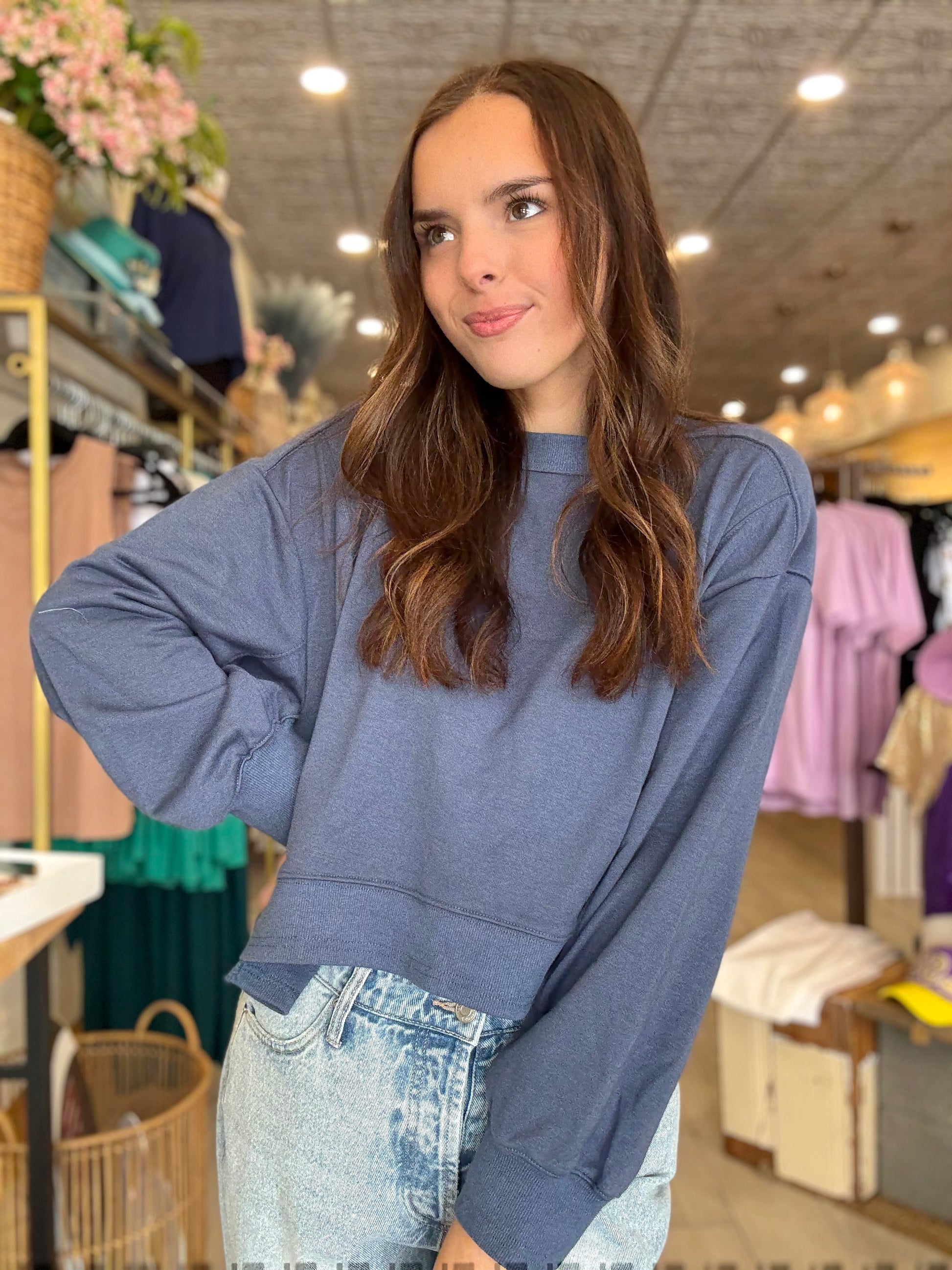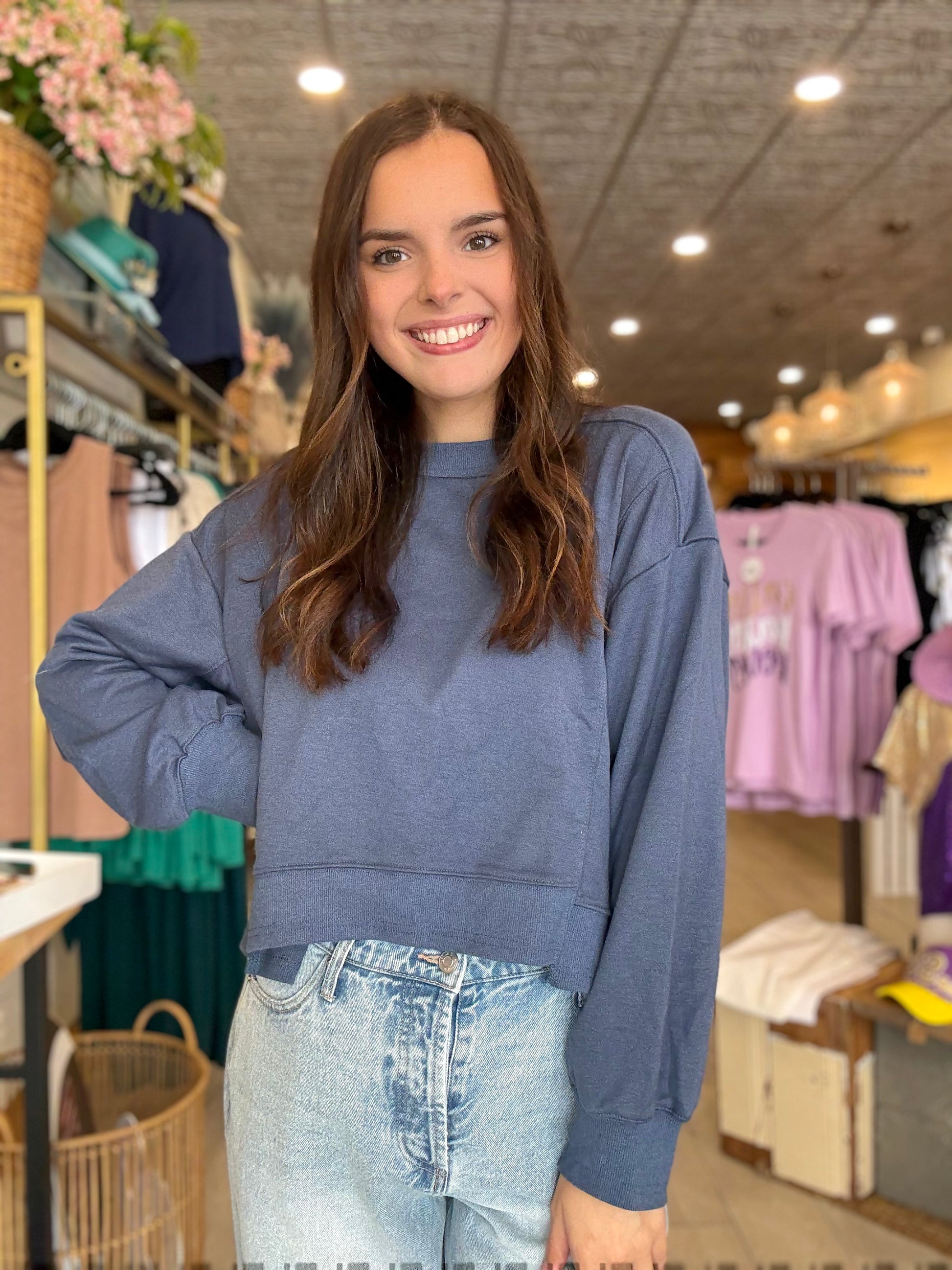 Laid-back meets effortlessly cool in the Moon Fade Sweatshirt. Featuring raw edge details and a layered hem for that perfectly undone vibe, this midnight blue essential brings a hint of edge to your cozy days. Pair it with denim or leggings for a lived-in look you’ll love on repeat.