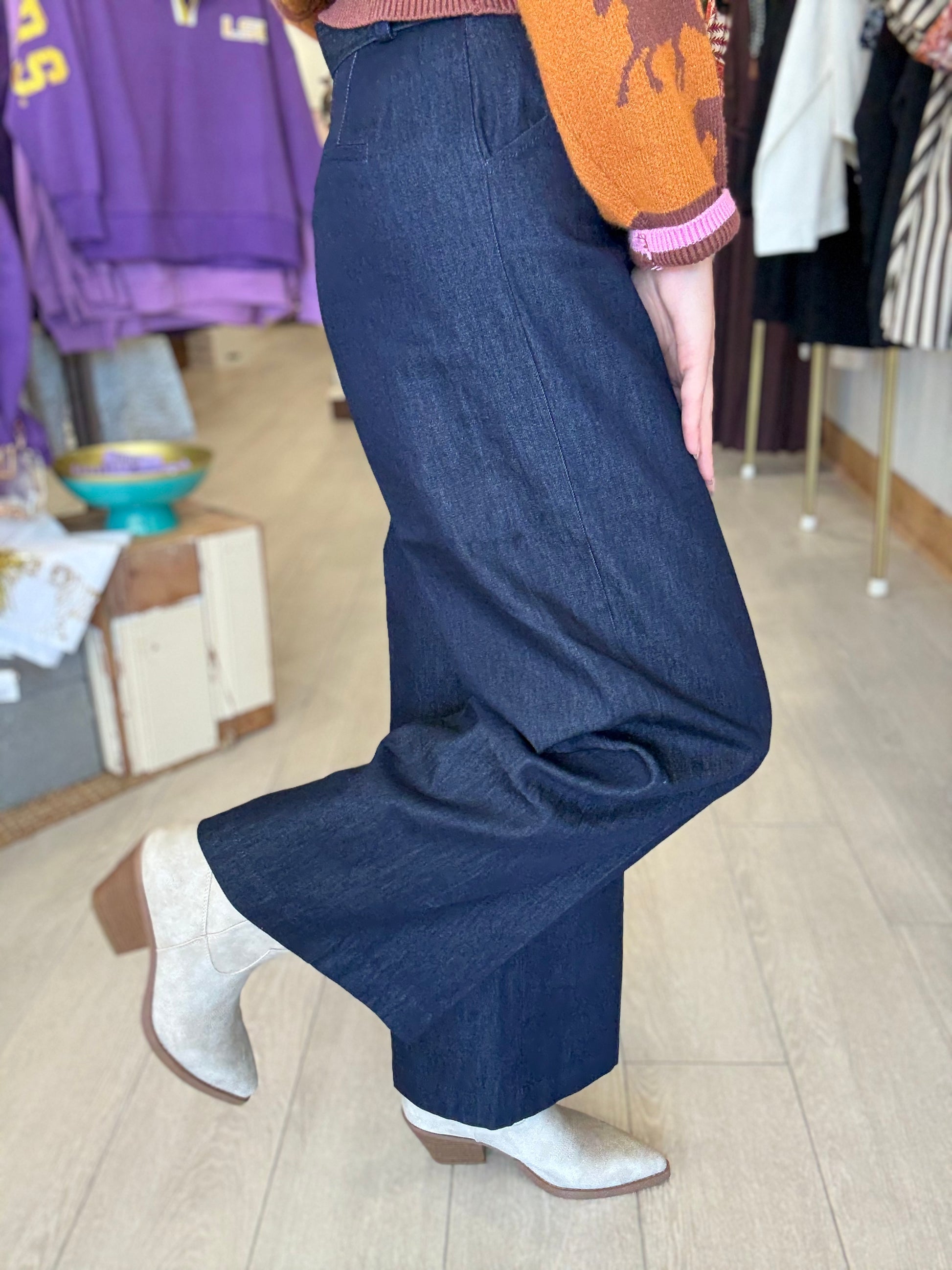 Effortlessly chic, the Nora Belted Denim Trouser from Lucy Paris blends timeless structure with a modern silhouette. Crafted from lightweight denim, this wide-leg pant features front pleats, deep pockets, and a matching self-tie belt that cinches the waist for a flattering fit. Perfect for dressing up with a crisp blouse or styling casually with a tucked-in tee — these trousers redefine everyday sophistication.