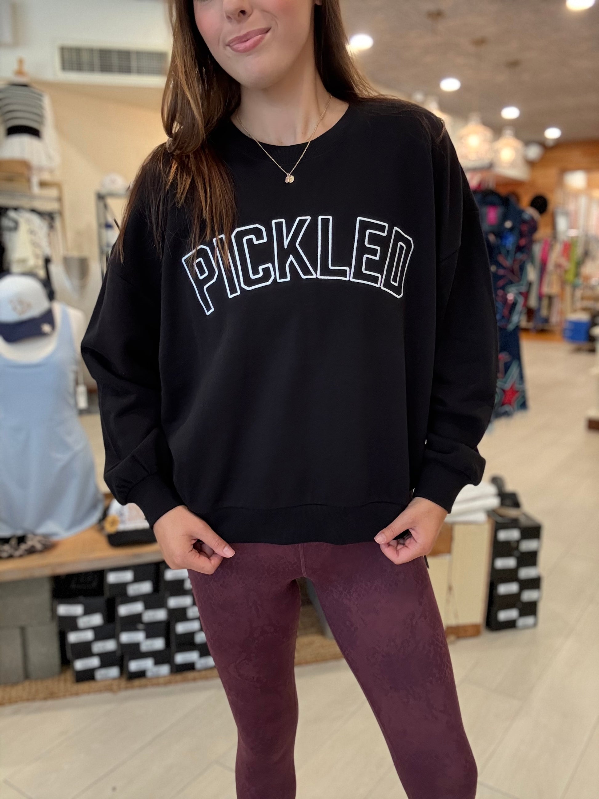 Celebrate the game with this brushed fleece crew neck, featuring embroidered “Pickled” lettering on the front. Soft, relaxed, this pullover is ready for both the court and the couch.