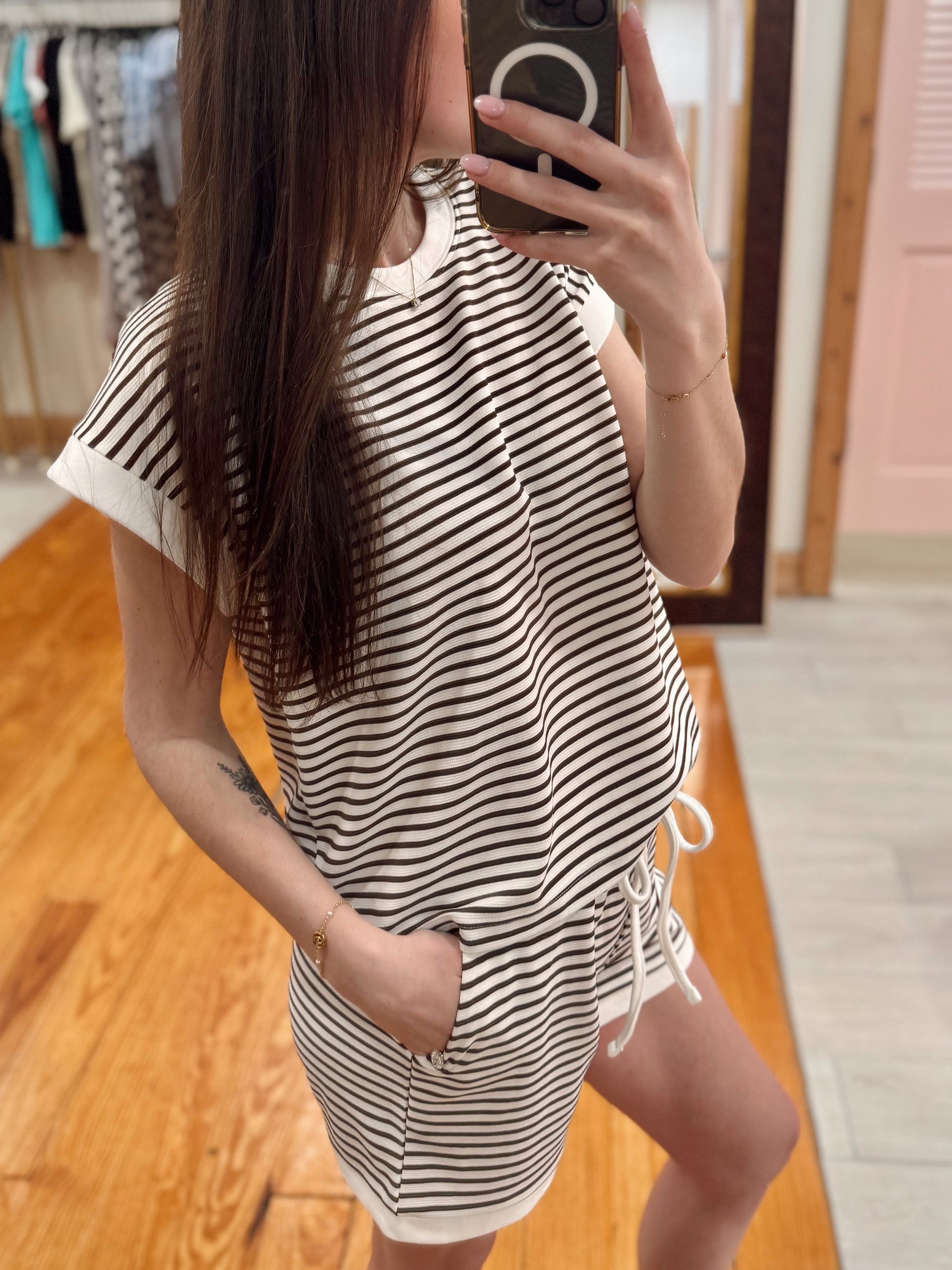 Meet your new go-to set. This brown and cream pinstripe matching set is the perfect mix of comfy and chic. The relaxed-fit top features a classic crew neckline with contrast trim and soft cap sleeves for an easy, flattering fit. The matching shorts have an elastic waistband with an adjustable drawstring and contrast hem detailing for that polished, put-together look.