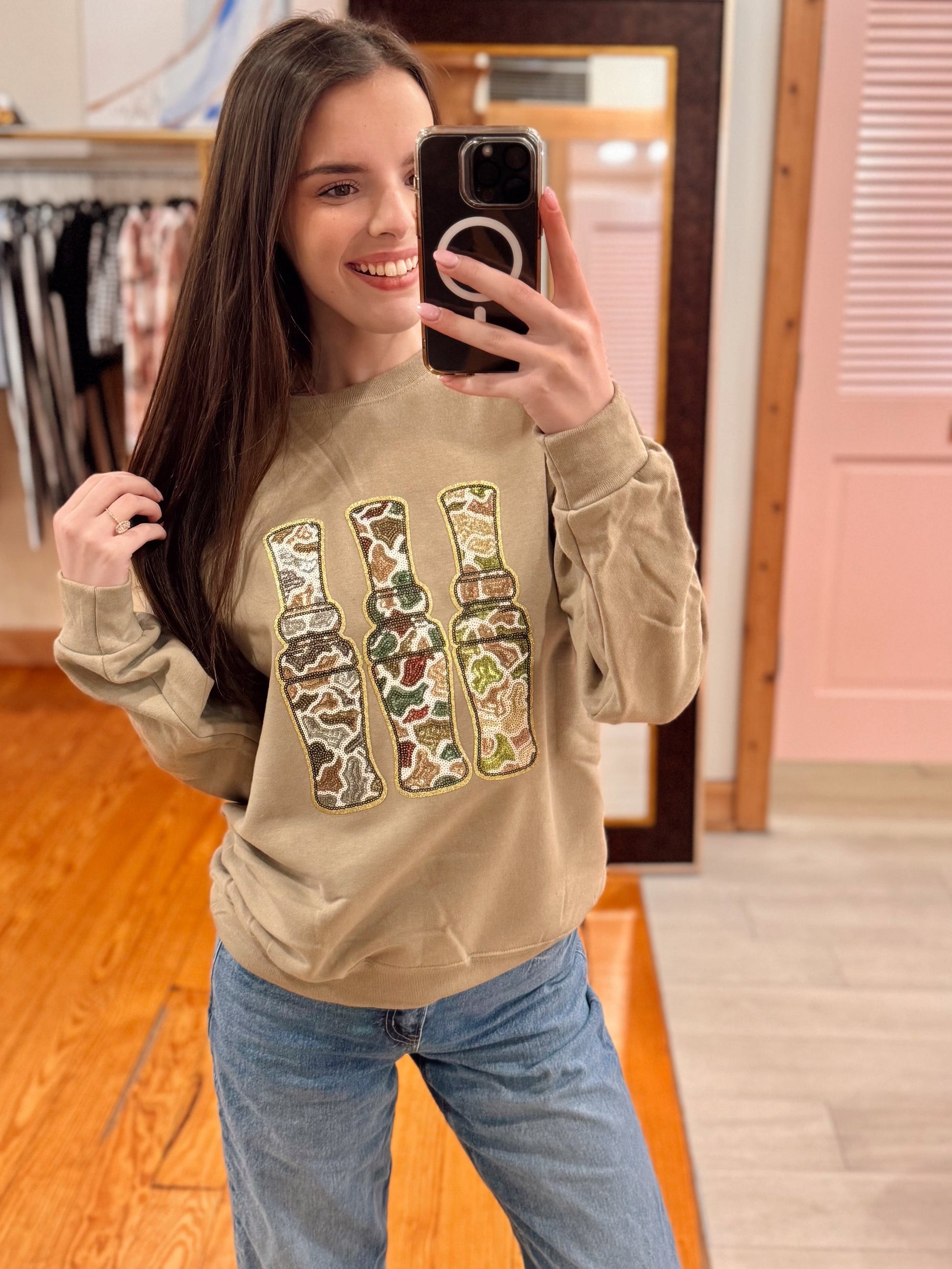 Cozy meets cool in the Camo Call Crewneck. Featuring a unique camo sequin call design on a soft, neutral sweatshirt, this piece brings subtle sparkle with an outdoors-inspired edge. With a relaxed, comfy fit and lightweight feel, it’s perfect for layering on cooler days, casual weekends, or showing off your love for camo in a chic way. Easy to style with denim, leggings, or joggers.