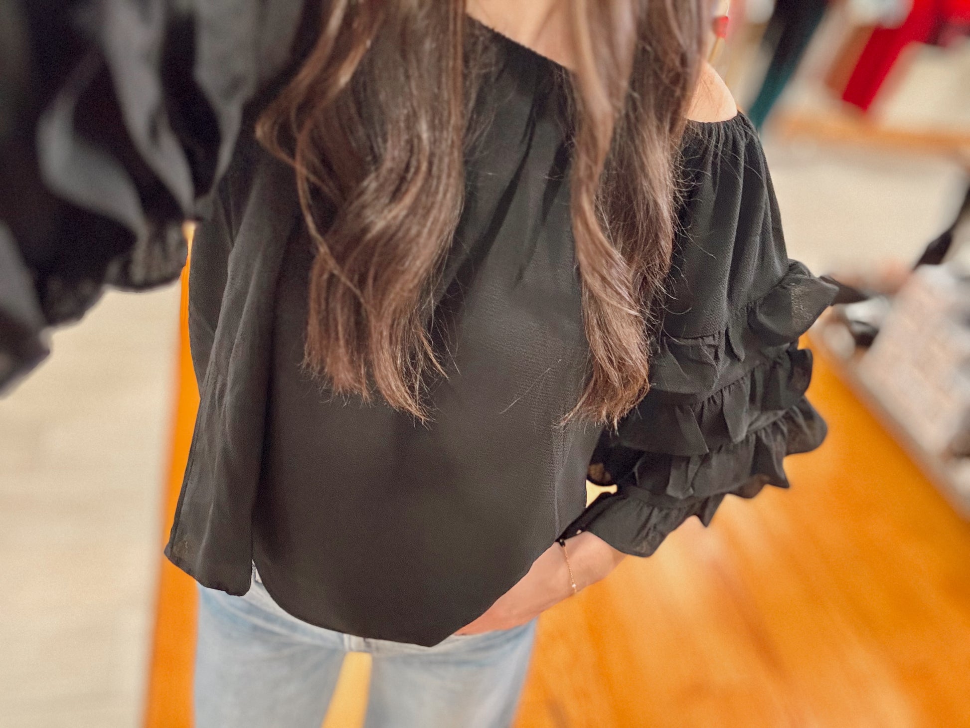 Soft, feminine, and effortlessly flattering — the Ruffle Me Pretty Top is a must-have for dressing up your everyday look. This off-the-shoulder blouse features romantic layered ruffle sleeves that add beautiful movement and just the right amount of drama.