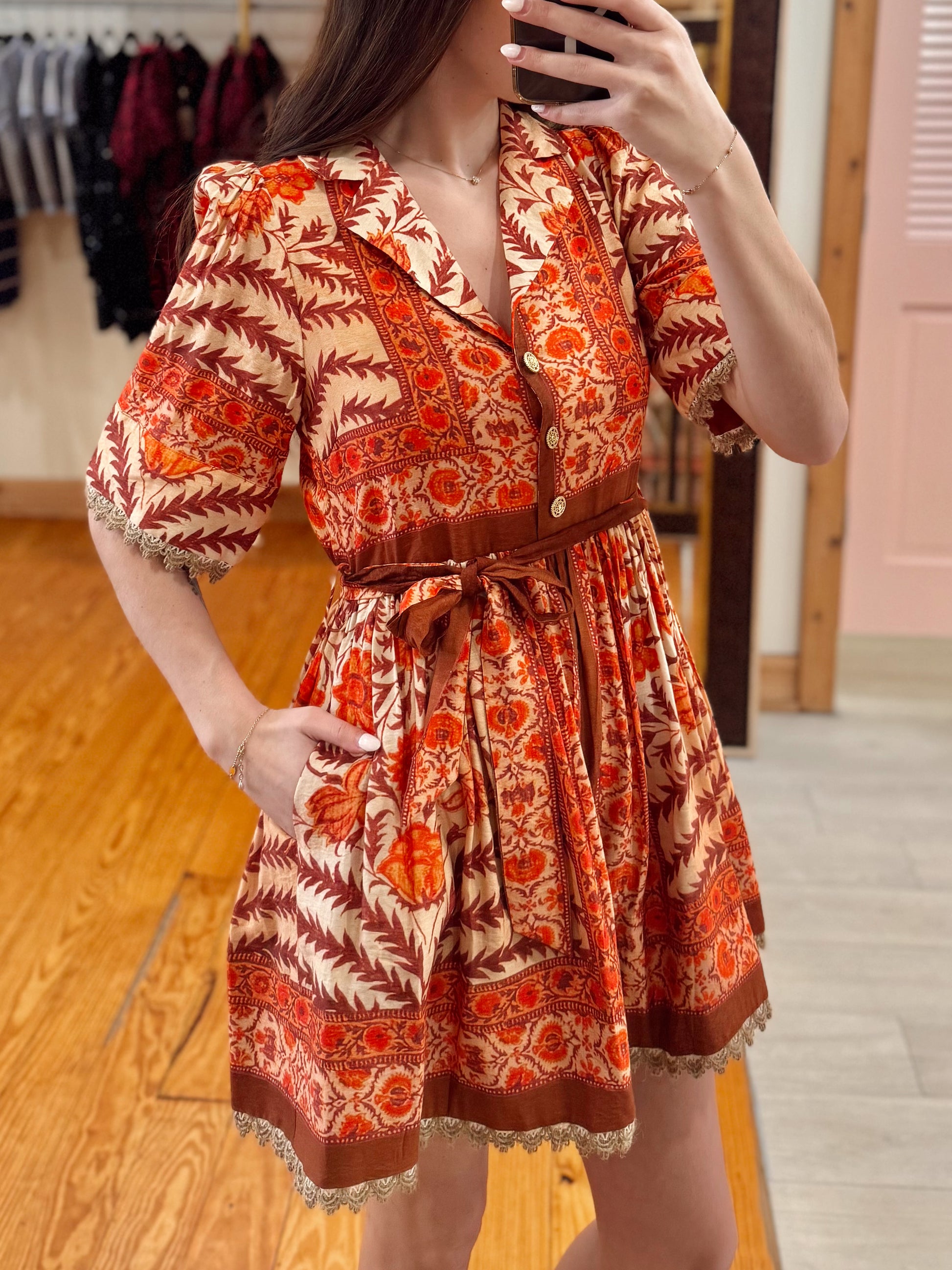Step into autumn vibes with this gorgeous vintage-inspired dress! Featuring a rich mix of burnt orange and earthy brown tones, this dress is designed with bold floral and leafy patterns that make a statement. The collared neckline and button-down front give it a polished touch, while the cinched waist creates a flattering silhouette. Puff sleeves and delicate lace trim add that perfect feminine flair. Lightweight and breathable, it’s the ideal dress for fall outings, festivals, or everyday wear.