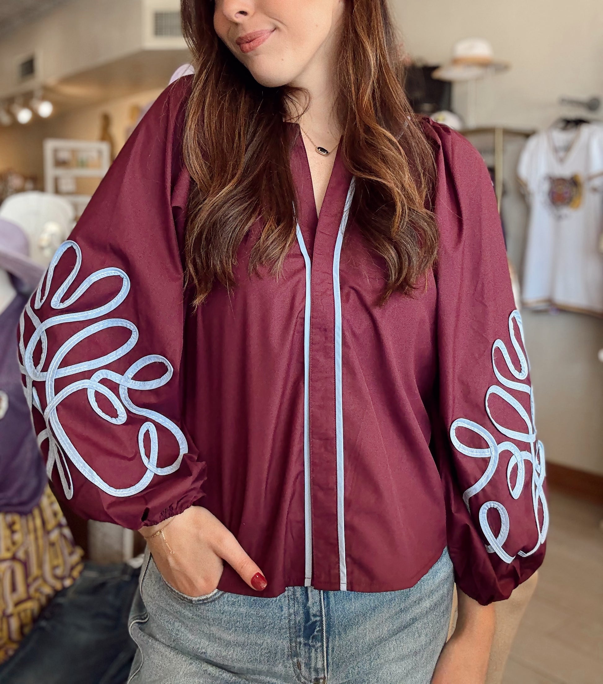 Make a statement with our Soutache Detail Blouse, a perfect mix of classic style and unique detailing. This deep wine blouse features dramatic balloon sleeves adorned with contrasting soutache embroidery for an eye-catching finish. The relaxed fit and lightweight fabric make it easy to wear, while the front placket with coordinating trim adds a polished touch. Dress it up with tailored pants or keep it casual with denim—either way, this blouse will turn heads.