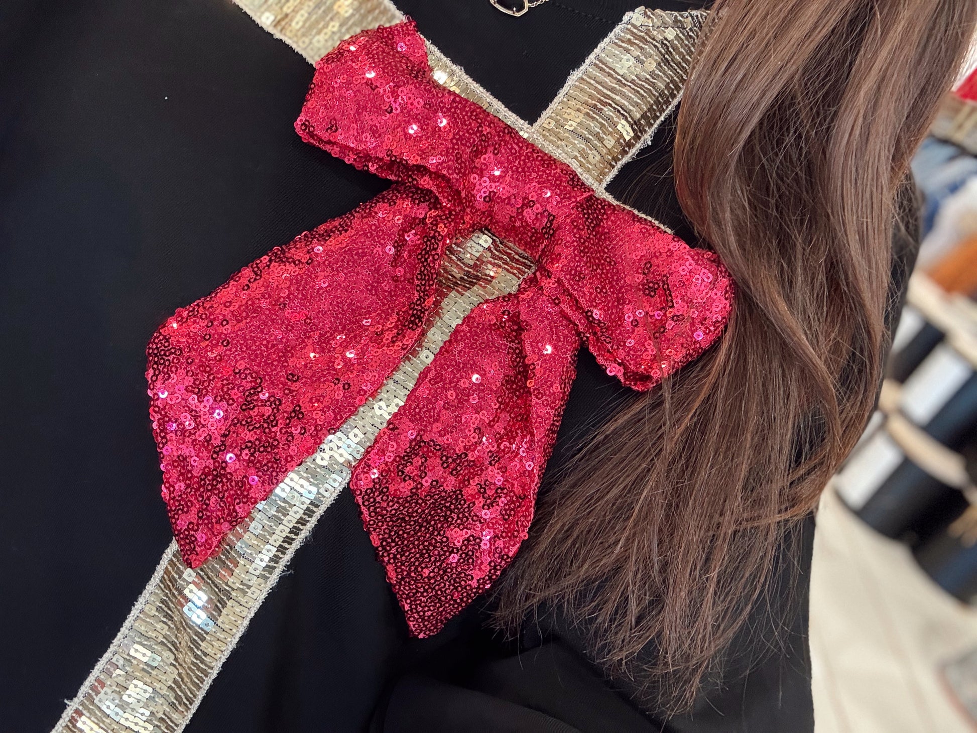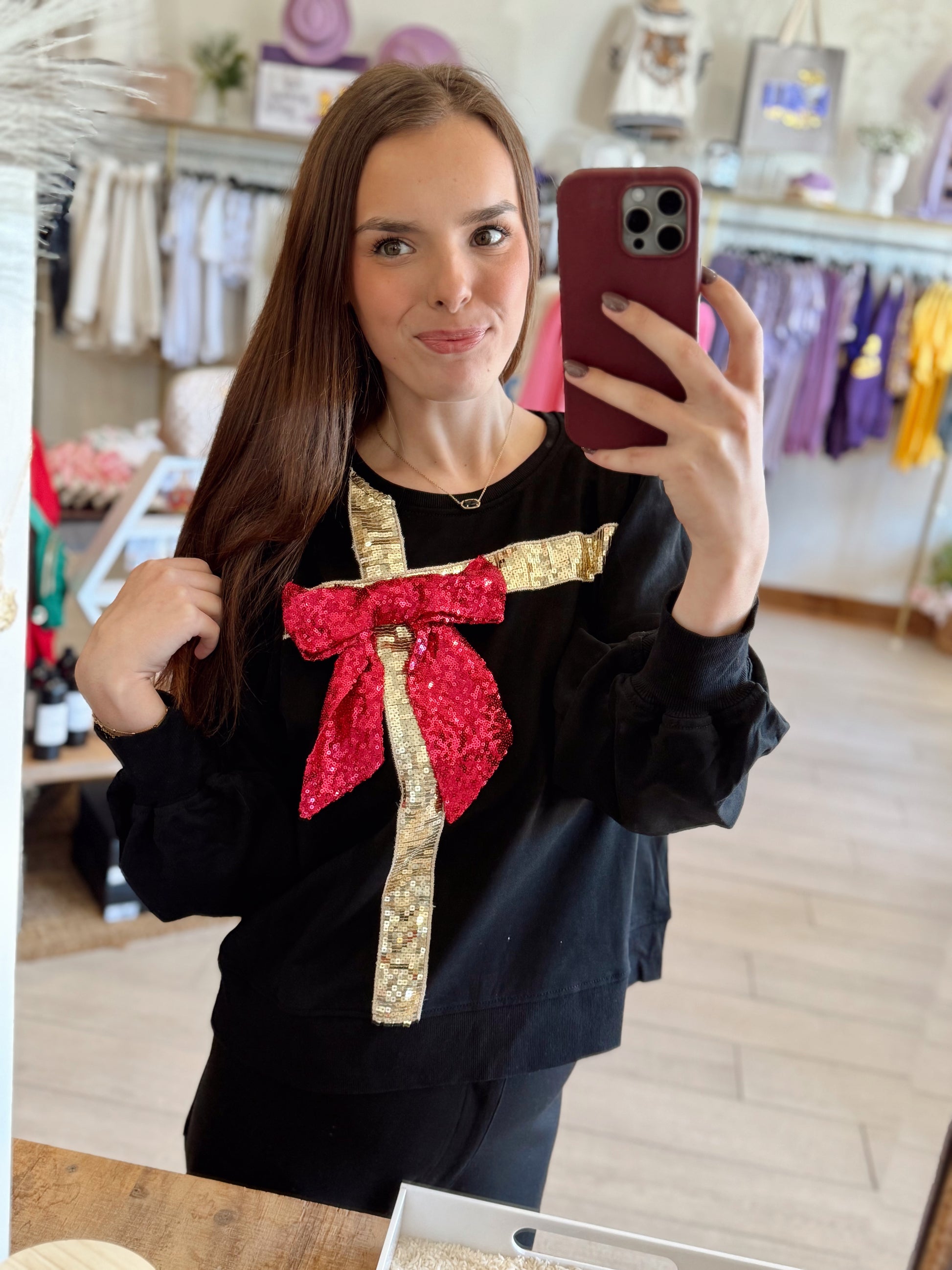 Give cozy a festive upgrade with our Wrapped in Gleaux Sweatshirt! 🎁 This black pullover features a sparkling gold ribbon and bold red sequin bow detail across the front — just like a perfectly wrapped present. With a relaxed fit and soft fleece interior, it’s both comfy and eye-catching. Pair it with sequin shorts or jeans for a holiday look that’s merry, modern, and oh-so-glam.