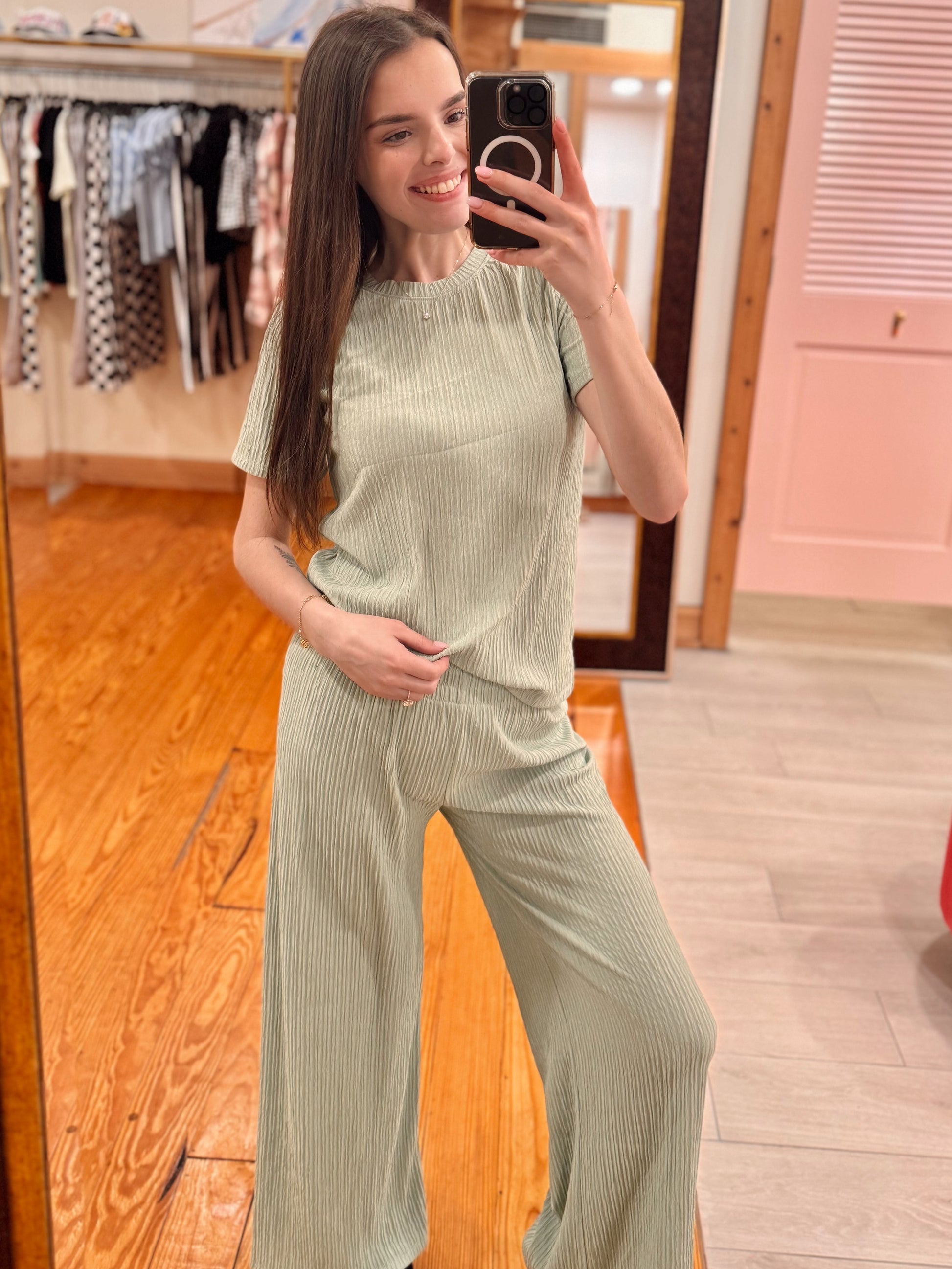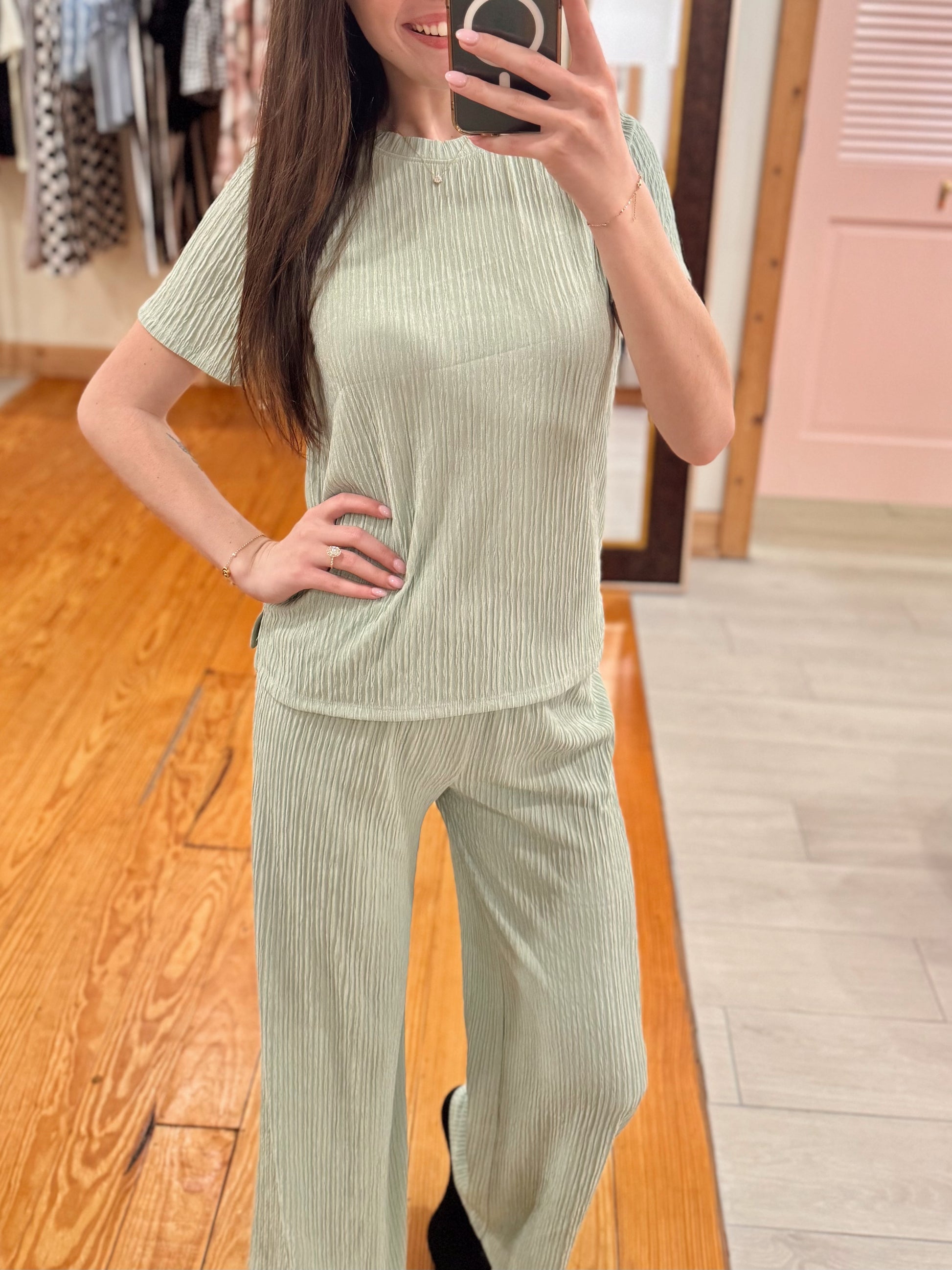 Easy, elevated, and oh-so-comfy. Our Soft serve Set features a soft ribbed texture in the prettiest muted sage green. The relaxed-fit top has a classic round neckline and short sleeves for that effortless throw-on-and-go look, while the matching wide-leg pants give you a flattering, flowy silhouette with all-day comfort.