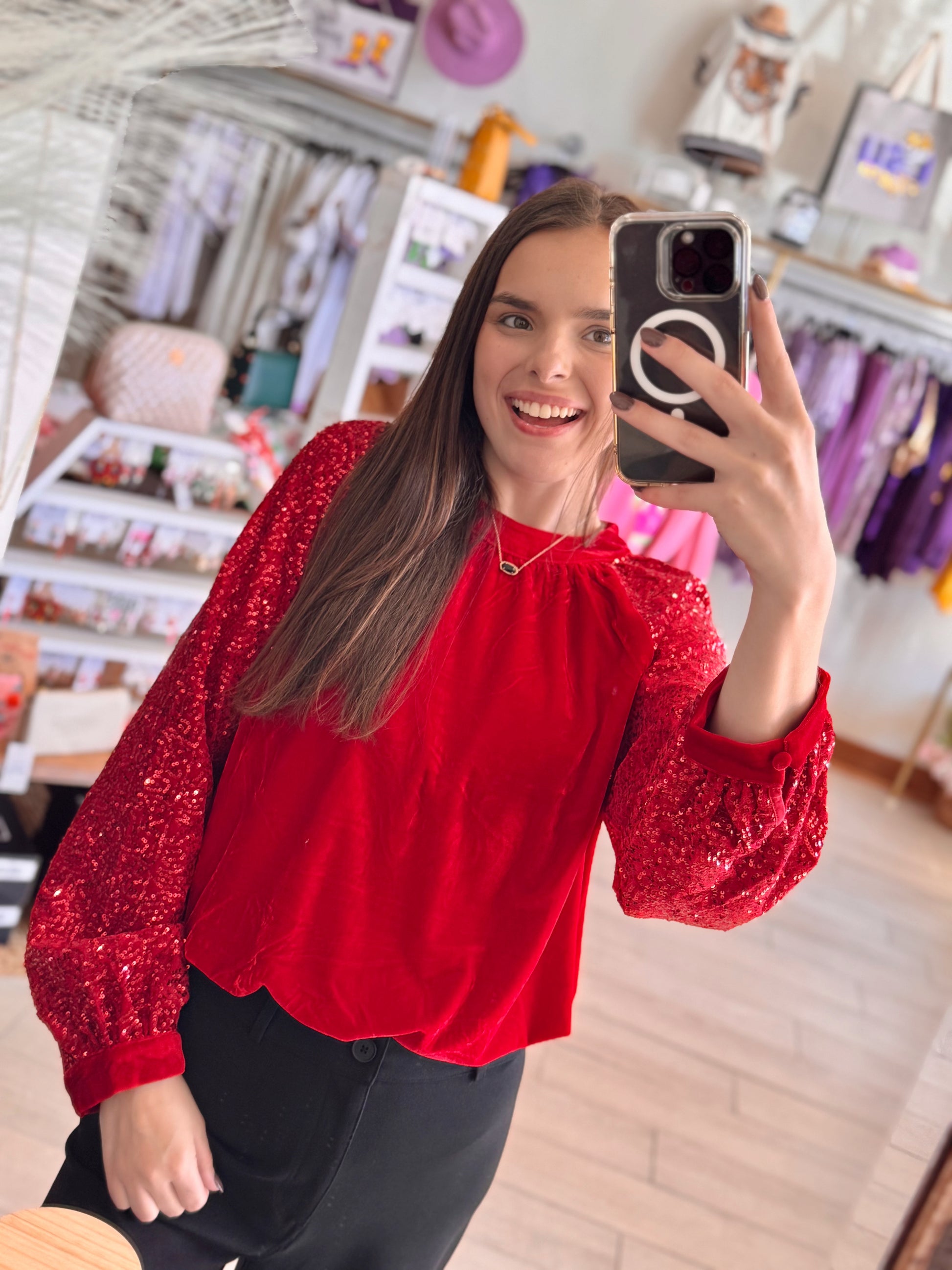 Rich red velvet meets sparkling sequin sleeves for a luxe look that’s merry, bright, and oh-so-glam. The gathered neckline adds a touch of elegance, while the relaxed fit keeps it comfortable enough for all-night celebrating. Style it with black skinnies, leather pants, or a sequin mini for a party-ready outfit that shines as bright as you do.