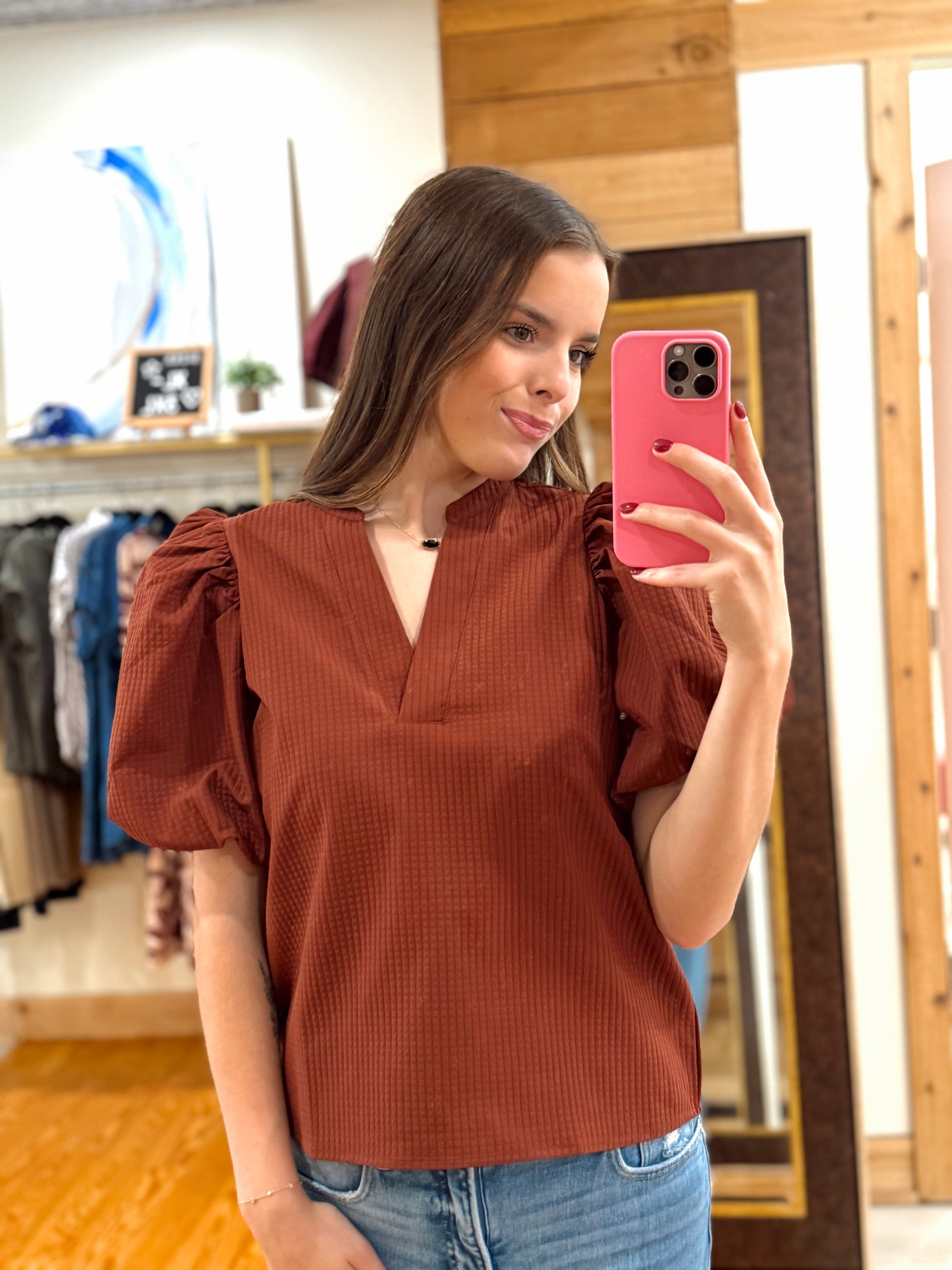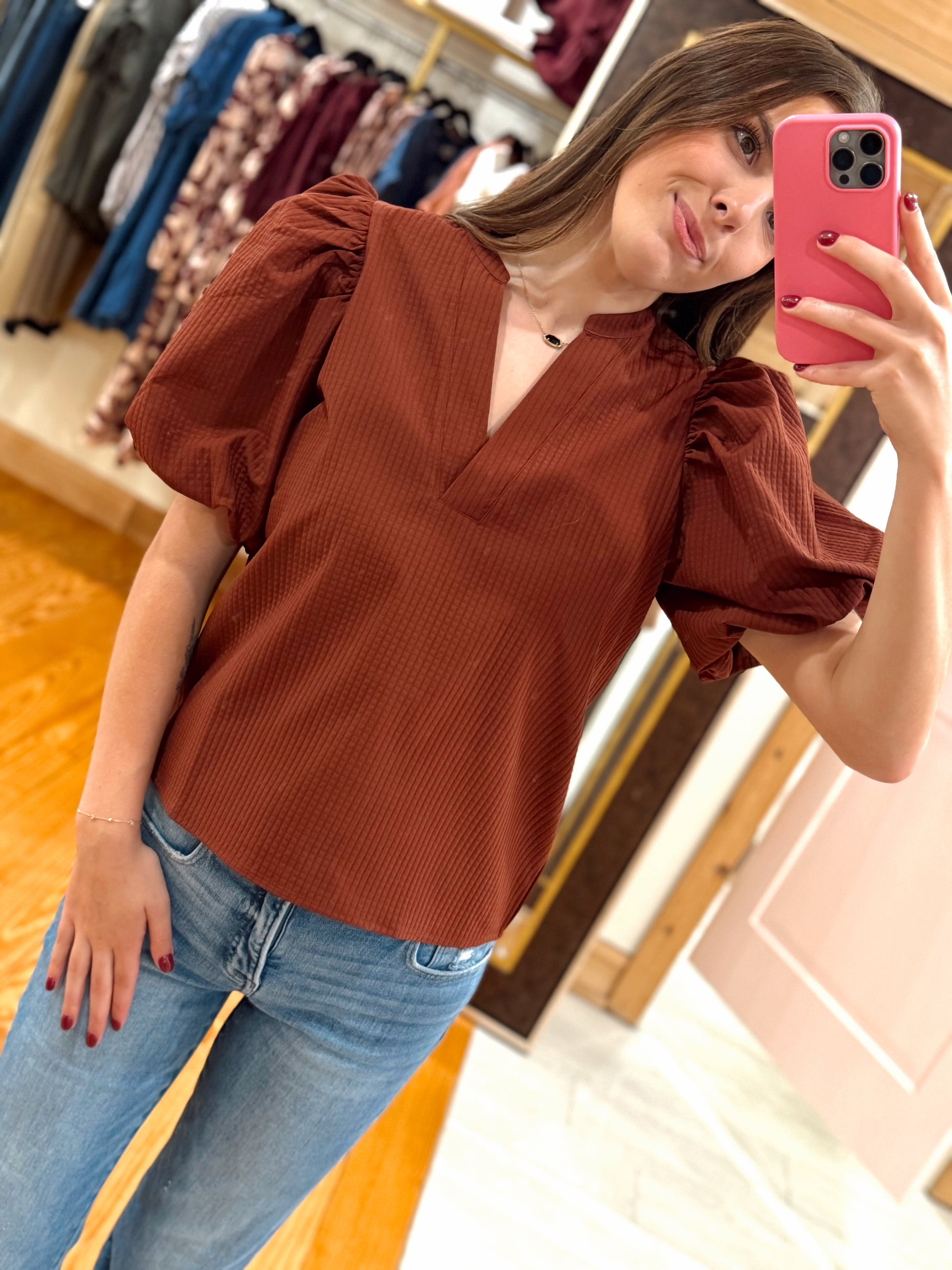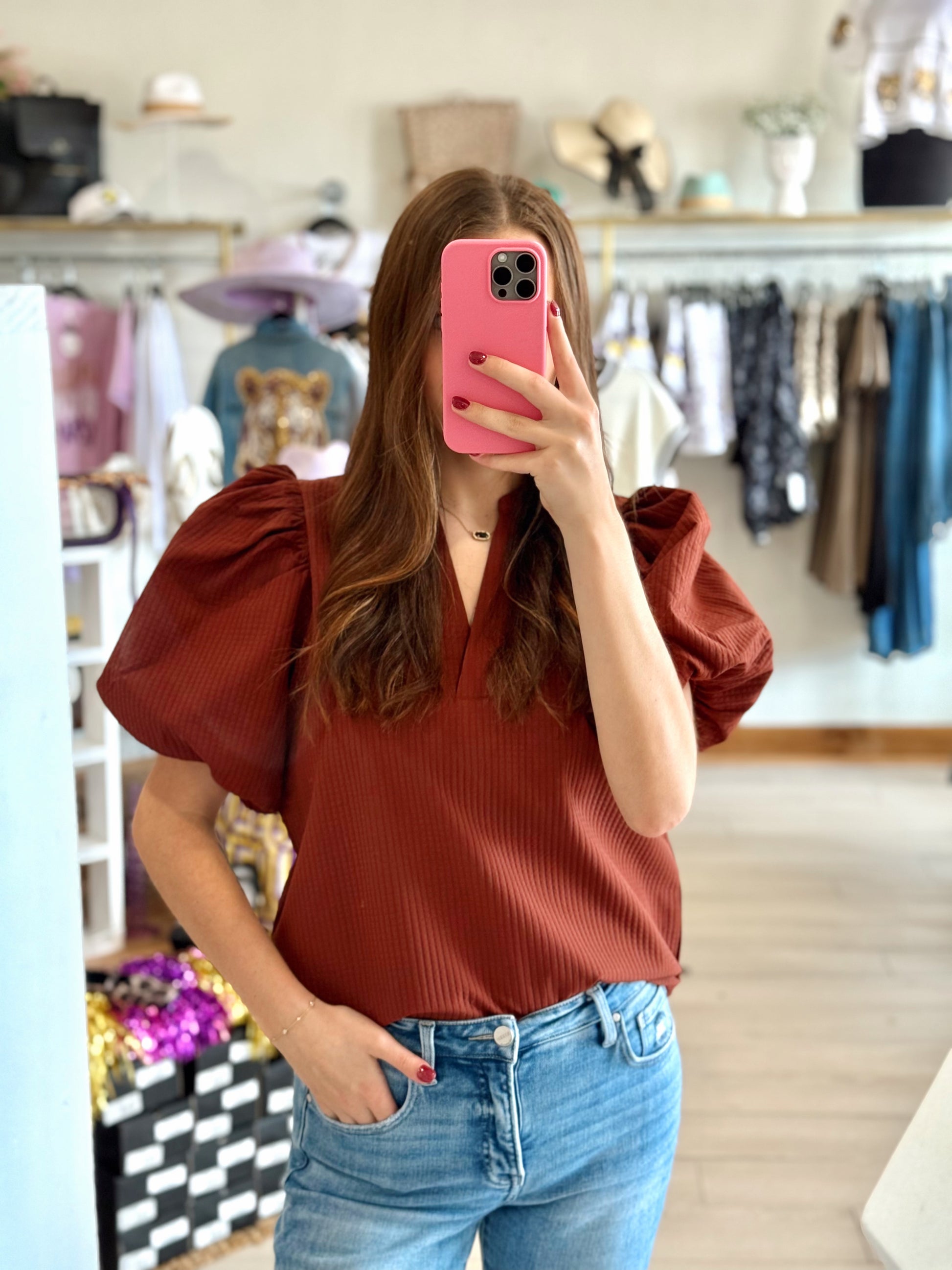 Add a bold pop of style to your wardrobe with our Rust Puff Sleeve Top. Crafted from a textured fabric in a warm rust hue, this statement piece features a flattering V-neckline and dramatic puff sleeves for a modern, feminine silhouette. Perfect for pairing with high-waisted jeans for a casual-chic vibe or with tailored trousers for a polished look, this versatile top transitions seamlessly from day to night.
