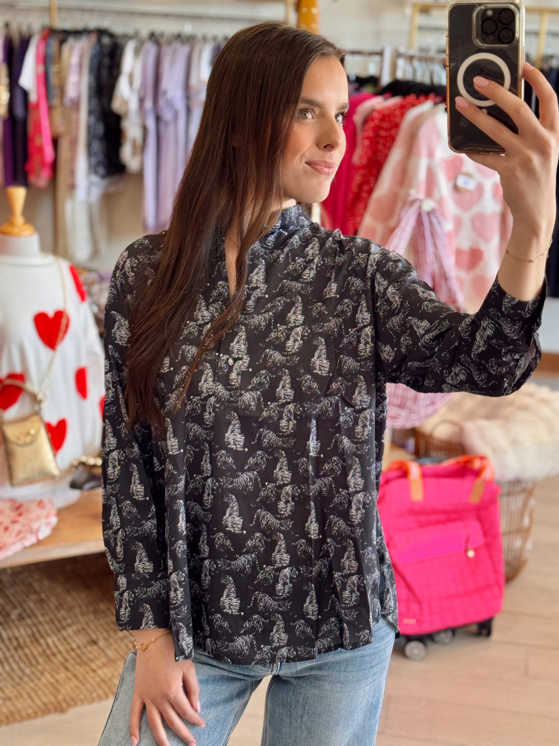 Bold, artsy, and full of Tiger spirit — the Watercolor Tiger Top by Sincerely Ours is a standout piece for every fan. Set against a rich navy blue background, the dreamy watercolor-style tiger graphic brings a fierce yet feminine vibe. Lightweight and ultra-comfy, this top is perfect for gameday or repping your Tigers in style all season long.