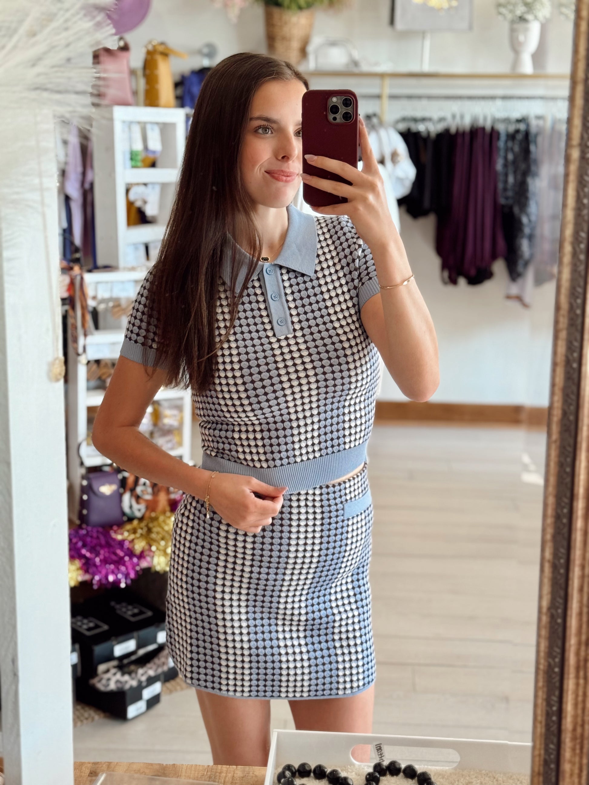Retro-inspired meets refined in the Callie Knit Polo Top from Lucy Paris. Designed in a soft stretch knit with a textured dot pattern in lavender and cream, this chic short-sleeve top features a classic polo collar and button front for a polished yet playful vibe. Pair it with the matching Callie Knit Mini Skirt for a coordinated look that’s equal parts modern and timeless.