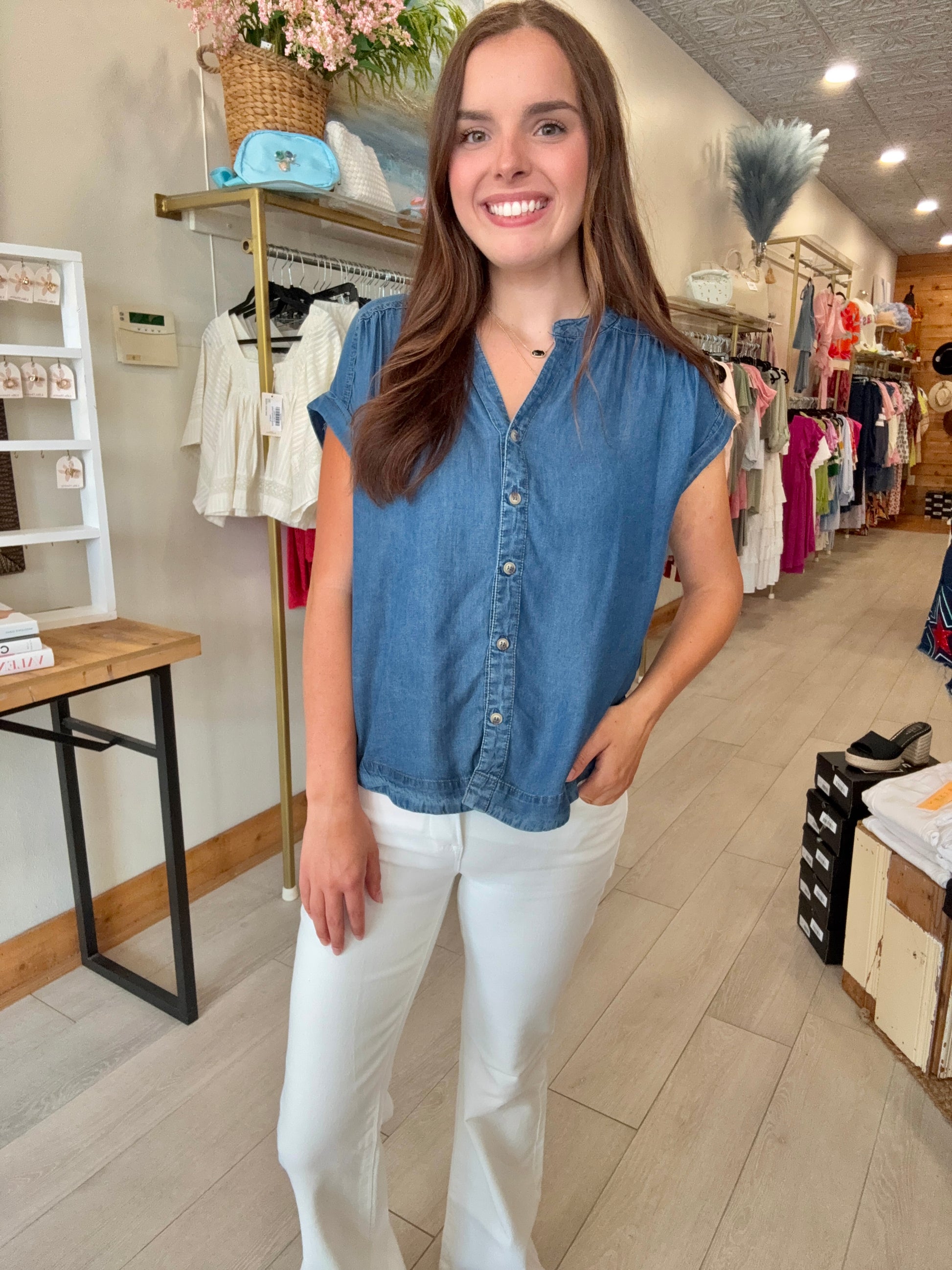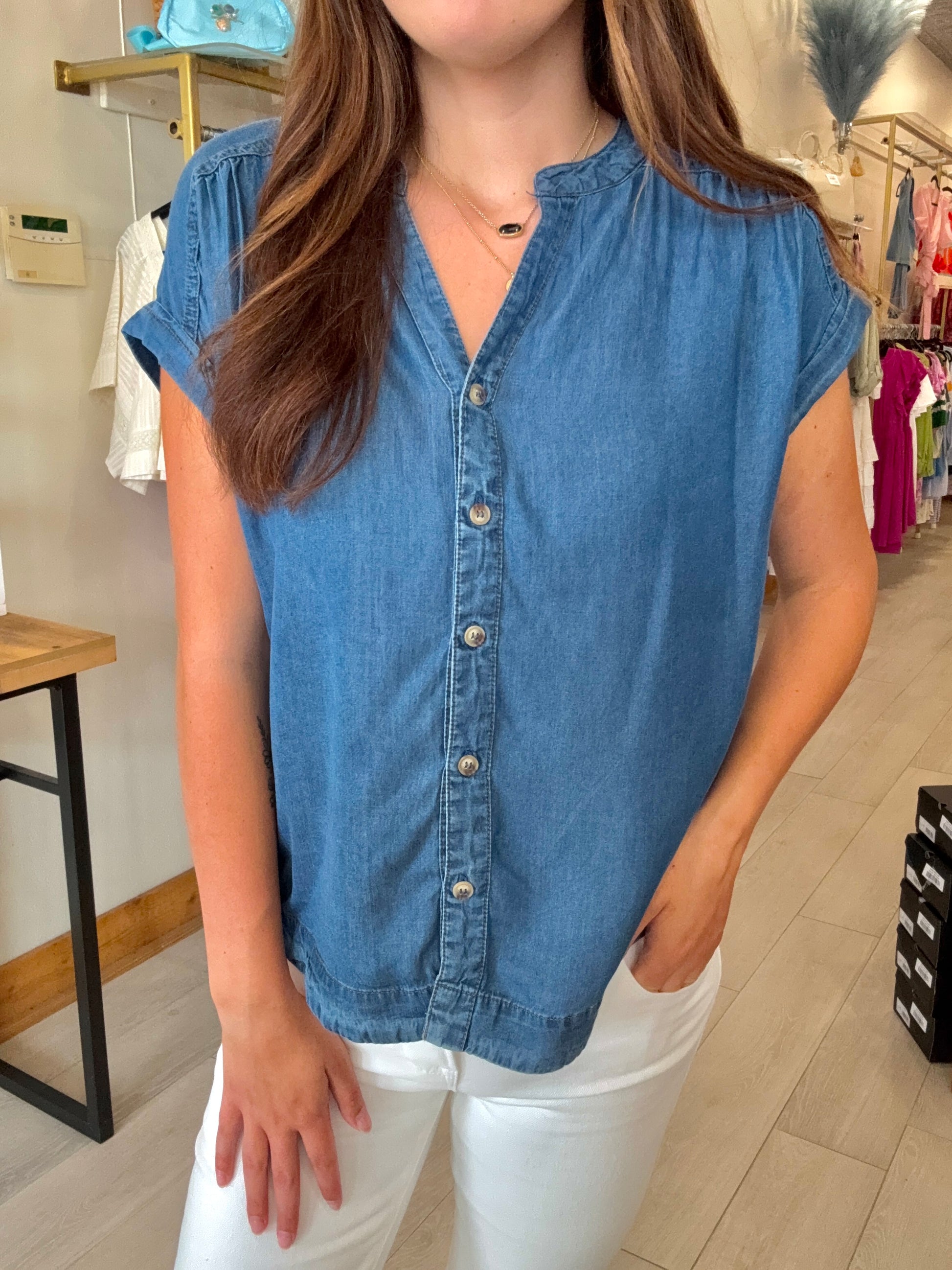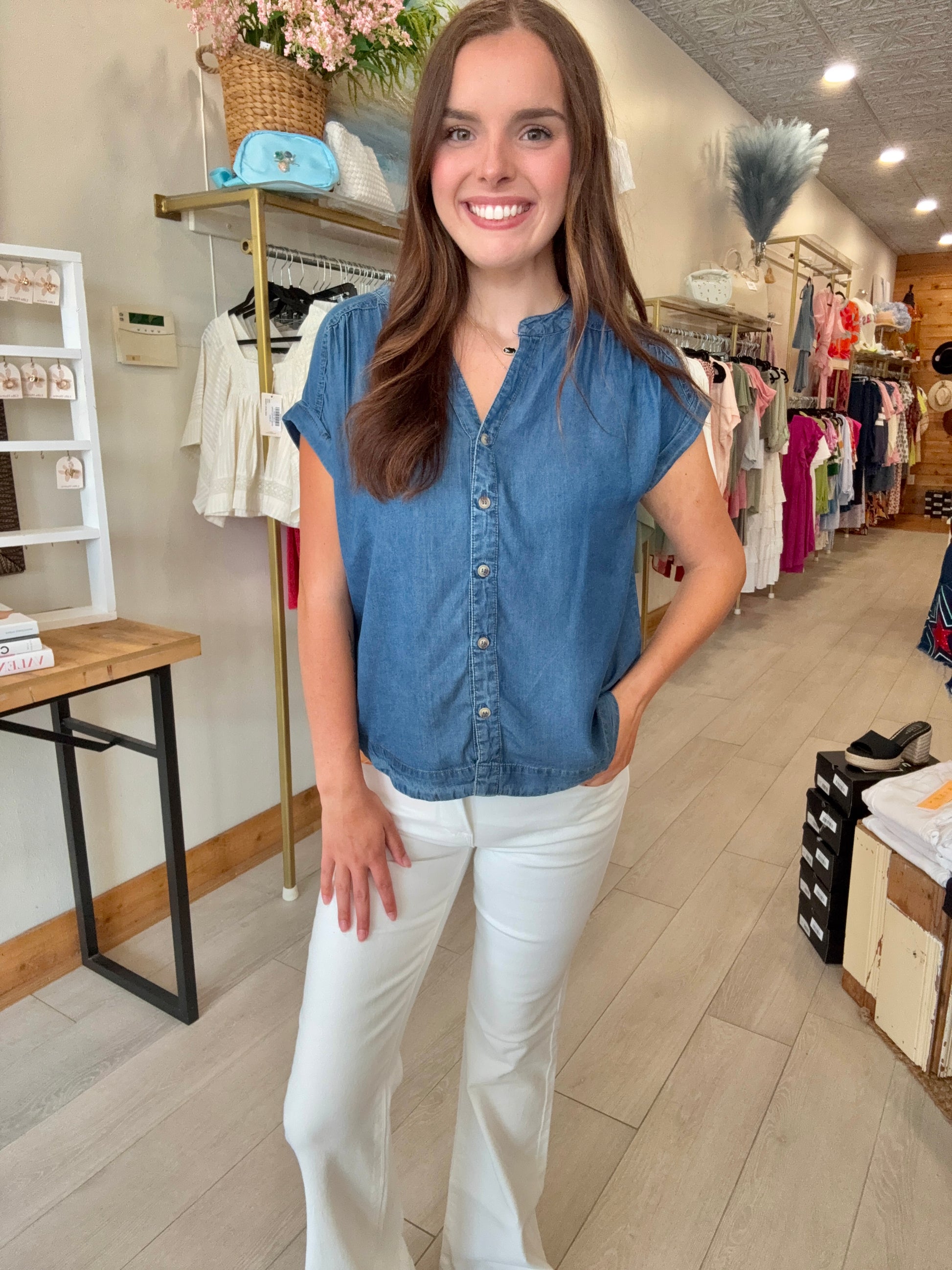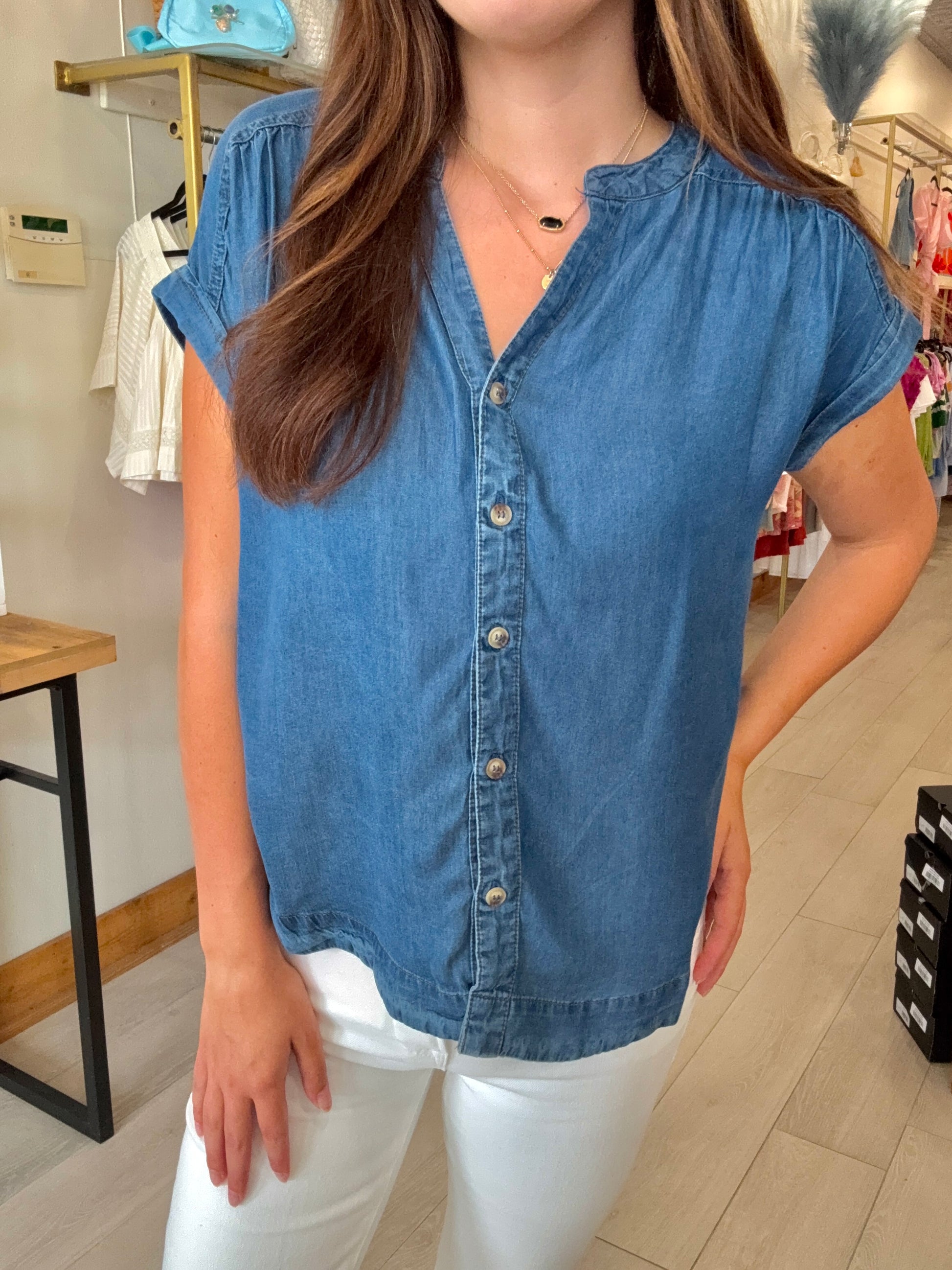 A timeless staple with a modern twist, this plus-size chambray top is your go-to for laid-back style. Crafted from soft, lightweight dark chambray, it features a classic button-down front and short sleeves for everyday comfort. The relaxed fit flatters your curves without clinging, making it perfect for layering or wearing solo. Dress it up with white jeans or keep it casual with cutoffs—either way, it’s an easy win.