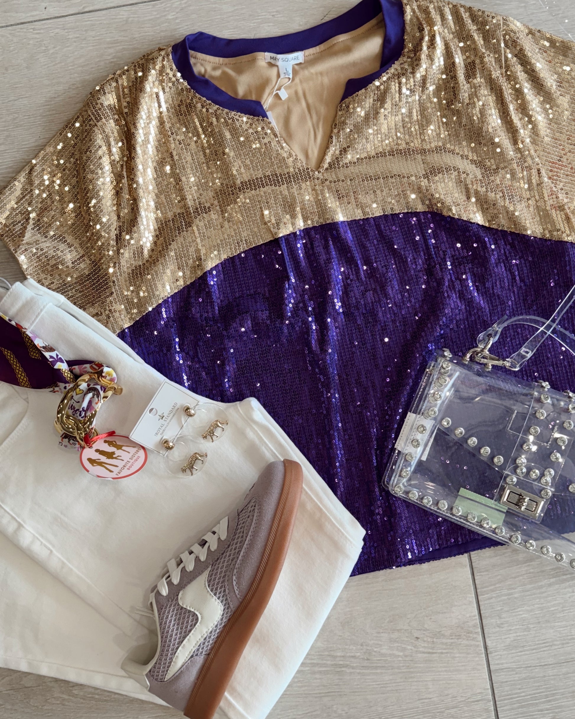 This blouse is a testament to our commitment to inspire and uplift women through fashion. The bold purple and gold tones embody strength and confidence, mirroring the spirit of the Mary Square community. Whether you're dressing up for a special occasion or adding a pop of color to your everyday wardrobe, this top is a versatile addition. Embrace life's little imperfections and create your journey with this expressive piece. Remember, we're cheering you on every step of the way.