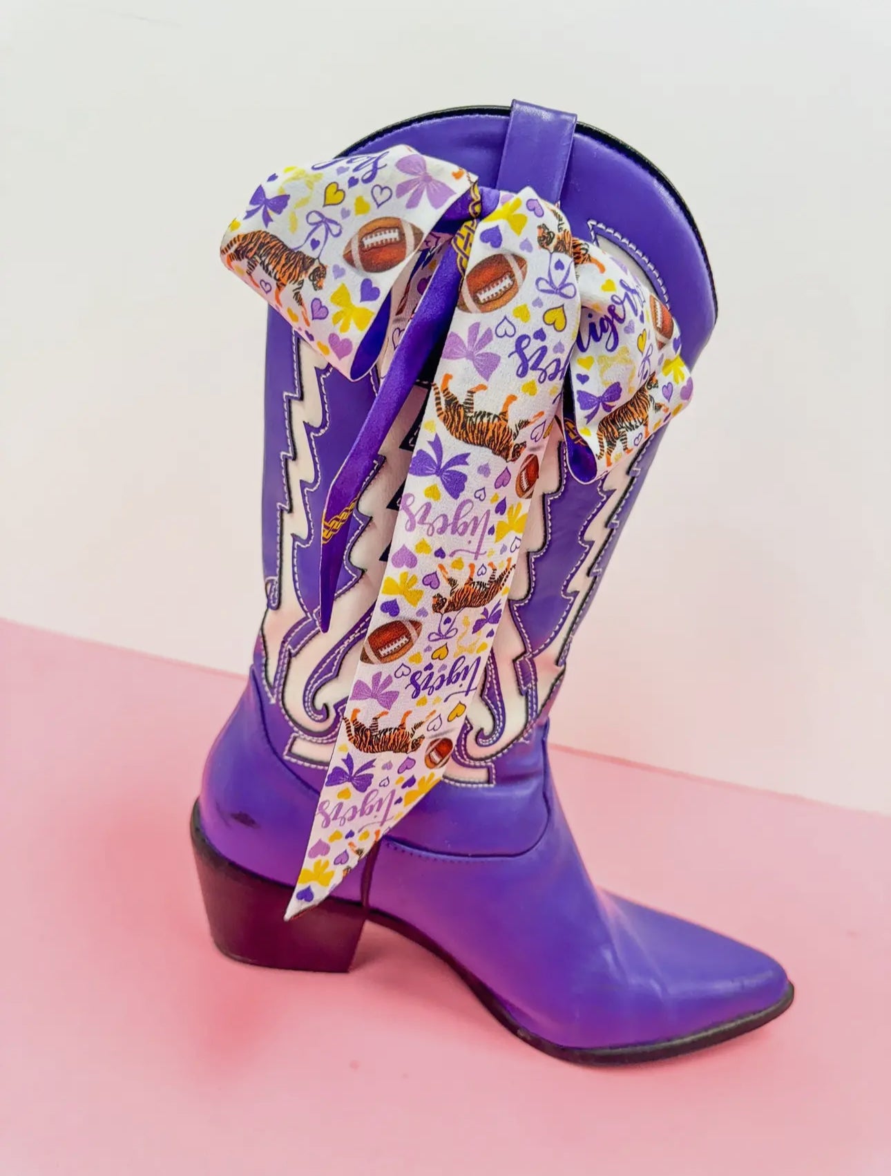 It's the perfect game day accessory! Our Tigers Silky Scarf is made from silk and measures 35" L X 2 "W. It can be worn on purse straps, boots, the wrist and hair!