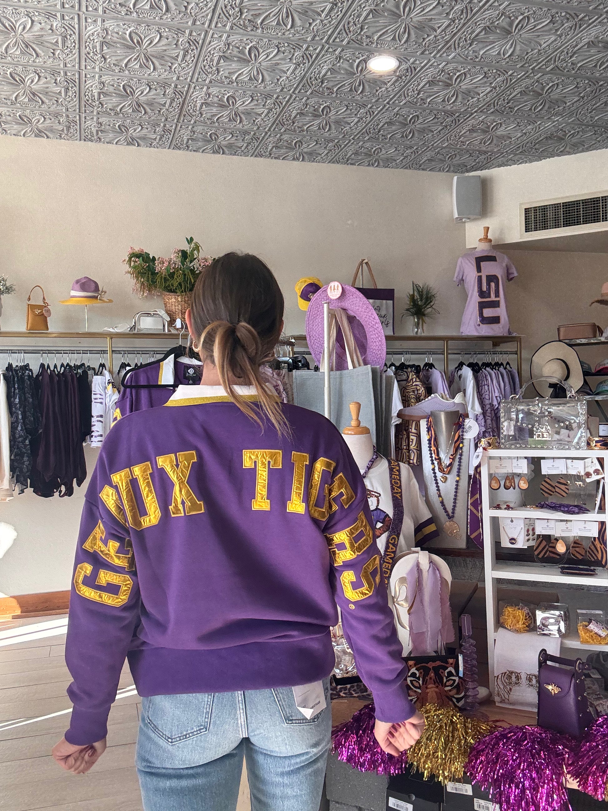 Show your LSU pride in style with our Geaux Tigers Spirit Rugby Pullover. This purple long-sleeve features bold gold chenille varsity letters spelling “GEAUX TIGERS” across the back and a classic LSU patch on the front. The collared neckline with gold and white stripe detailing adds a sporty, vintage-inspired touch.