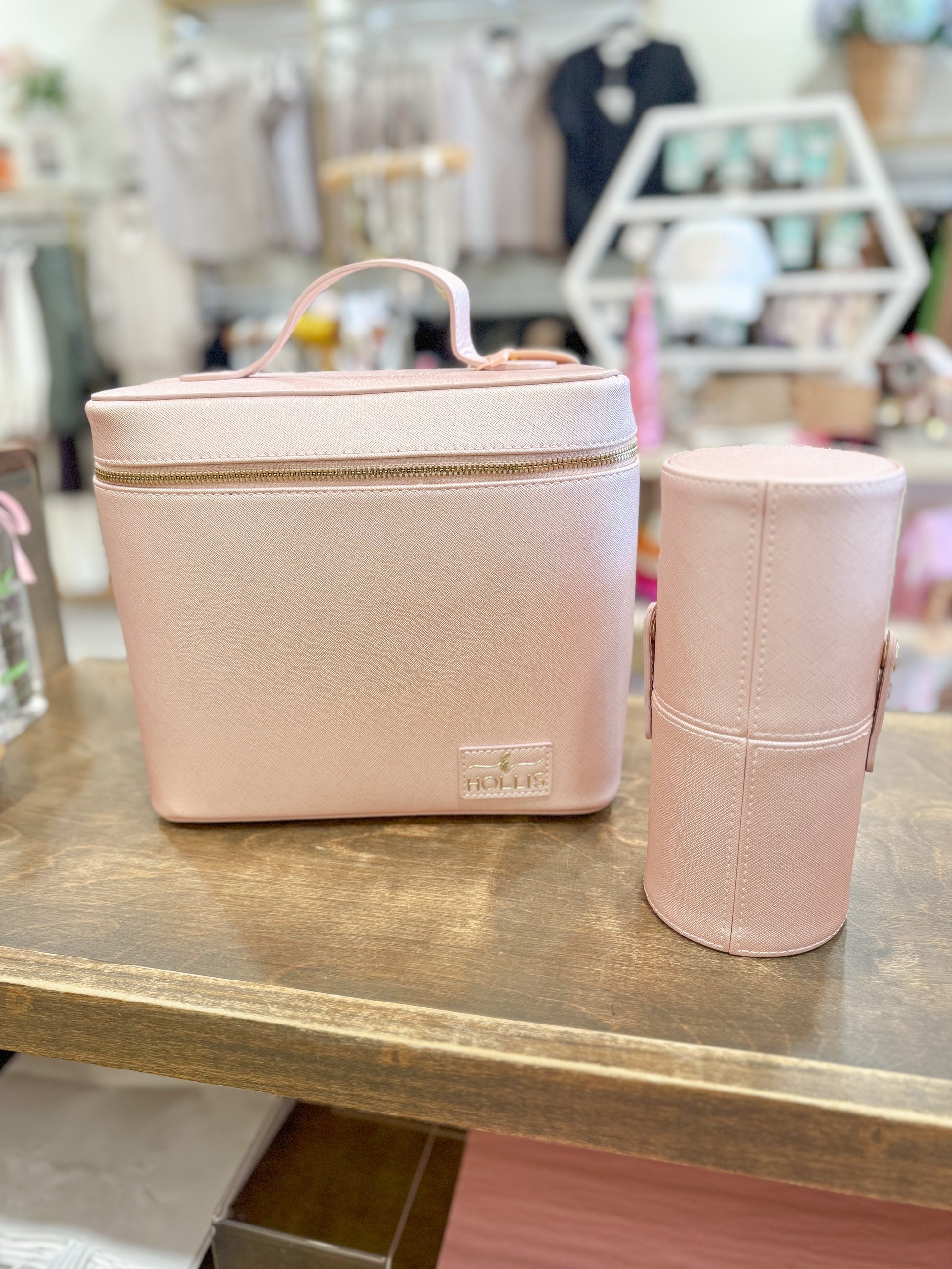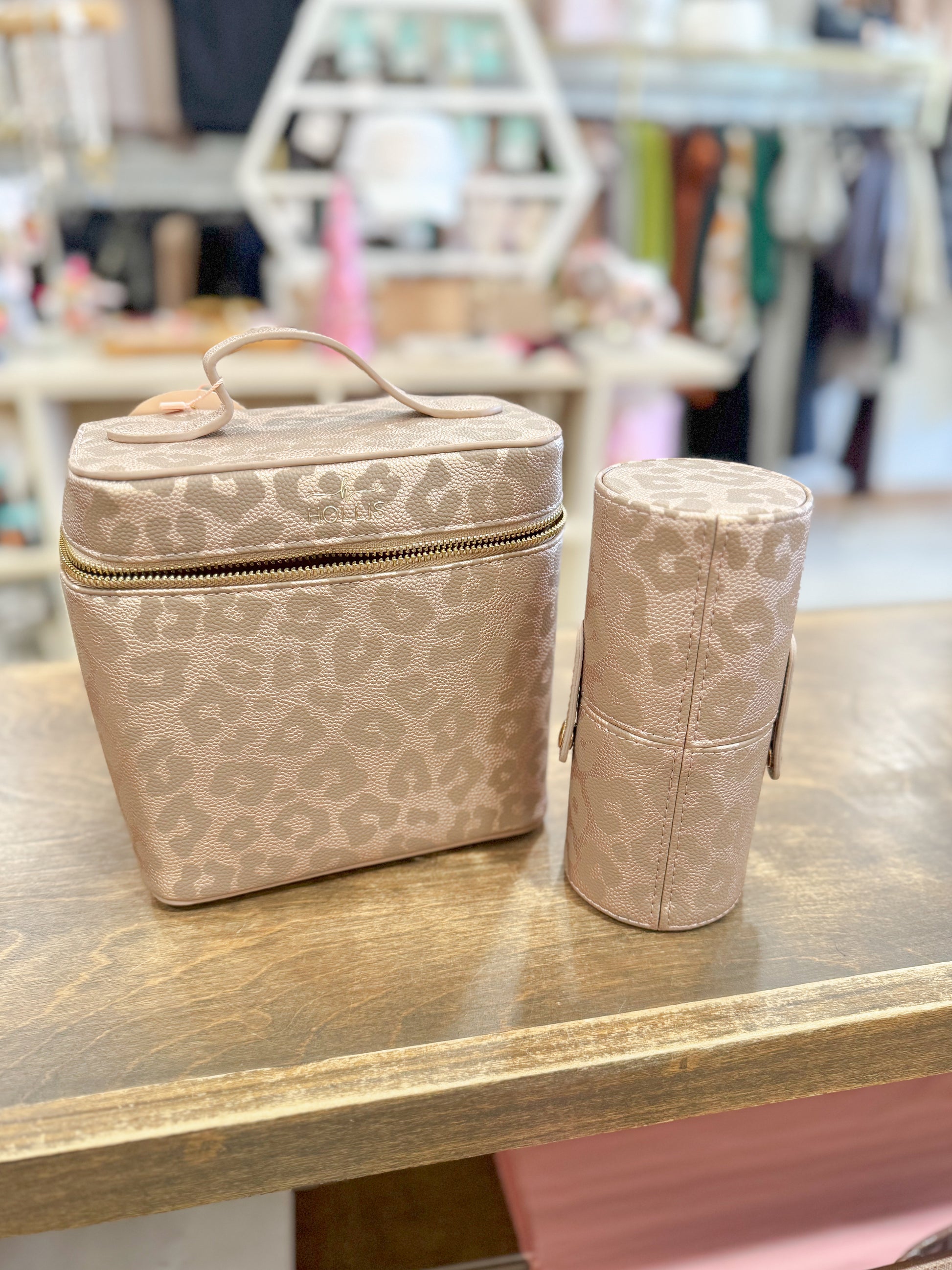 The Hollis Travel Makeup Kit is your perfect on-the-go beauty companion, designed to keep your makeup essentials organized and accessible wherever you travel. This sleek and compact kit comes with a dedicated pouch to store your makeup brushes, ensuring they stay clean and protected. Available in two stylish designs—soft Light Pink for a feminine touch, and bold Cheetah Print for a fun, wild flair—this makeup kit is as fashionable as it is functional. The roomy interior offers space for your favorite cosmetics, while the brush pouch helps keep everything neatly separated. Whether you’re traveling for business, pleasure, or just need a chic solution for your beauty routine, the Hollis Travel Makeup Kit has you covered in style.