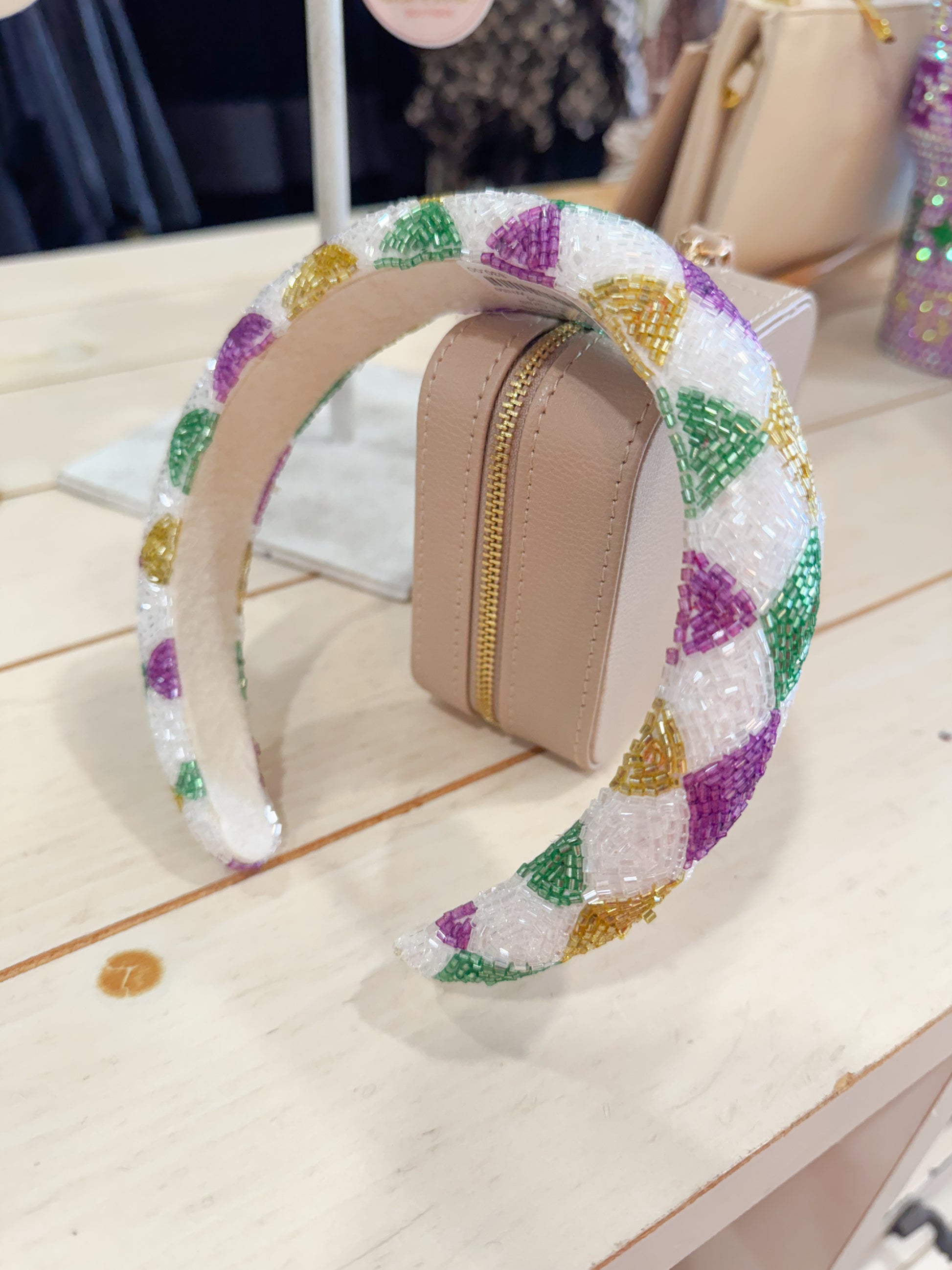 Celebrate Mardi Gras in style with this festive headband! Featuring a vibrant mix of white, purple, yellow, and green, this accessory perfectly captures the spirit of the season. The comfortable band is adorned with shimmering accents and playful details, ensuring you’ll stand out whether you’re on the parade route or at a party. Lightweight and easy to wear, it’s the ideal finishing touch to any Mardi Gras outfit. Let the good times roll with this colorful, eye-catching headband!